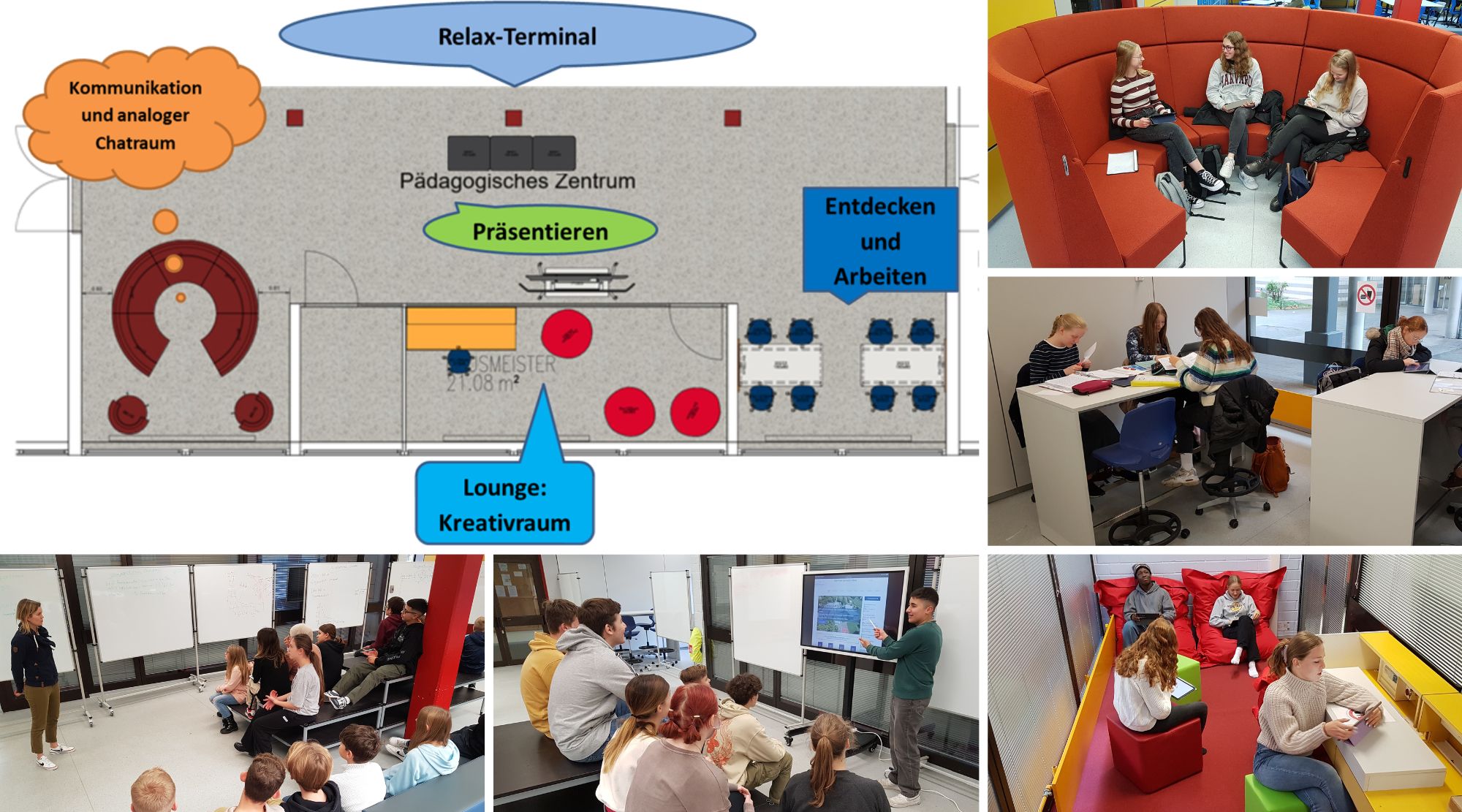 Zweites Element der Lernlandschaft ist der "Thinking Space", ein Klassenraum, der zu einer kreativ gestalteten Lernumgebung umgebaut wurde: mit Arbeits- und Präsentationsbereich, flexiblem Mobiliar und beweglichem Smart-TV. Schulleiter Damberg erläutert: "Dieser Raum bietet zahlreiche Möglichkeiten für kommunikative Lernarrangements, steht jedoch zunächst leider nur der Oberstufe für individualisierte Lernprozesse in den naturwissenschaftlichen Fächern zur Verfügung." Anders der "iCreative Space", das dritte Modul der Space-Lernlandschaft. Er steht bereits heute der Gesamtheit der Schüler und Lehrer zur Verfügung. "i" steht dabei für innovativ und individuell. Ein 120 Quadratmeter großer Bereich wurde hierzu in unterschiedliche Teilräume untergliedert, die ein handlungsorientiertes, offenes und projektorientiertes Lernen ermöglichen sollen: So beinhaltet der "iCreative Space", der eigentlich eine eigene Lernlandschaft darstellt, einen Kreativraum ("Kommunikation"), ein überdimensionales Relax-Terminal mit Rundum-Sitzfläche, das wahlweise auch als Bühne genutzt werden kann ("Präsentation"), einen Bereich mit Arbeitsplätzen in Form von Stehtischen und Hockern ("Entdecken und Arbeiten") oder auch ein beinahe geschlossen rundes Sofa mit überdimensional hohen Rückenlehnen für das abgeschirmte Arbeiten in kleinen Gruppen.