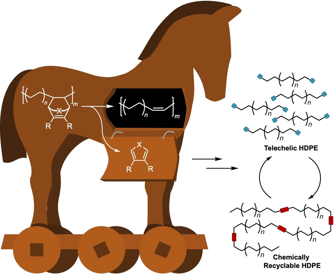 Kunststoffe aus Polyolefinen sind aus unserem täglichen Leben kaum mehr wegzudenken. Leider hapert es an praktikablen Recyclingwegen. In der Zeitschrift Angewandte Chemie stellt ein Forschungsteam jetzt einen Ansatz für neuartige Polyolefine vor, die chemisch zerlegt und ohne Qualitätsverlust wieder polymerisiert werden können. Erfolgsgeheimnis sind maskierte Doppelbindungen, die mit speziellen funktionellen Gruppen wie mit einem „Trojanischen Pferd“ in die Polymerkette eingebracht werden.