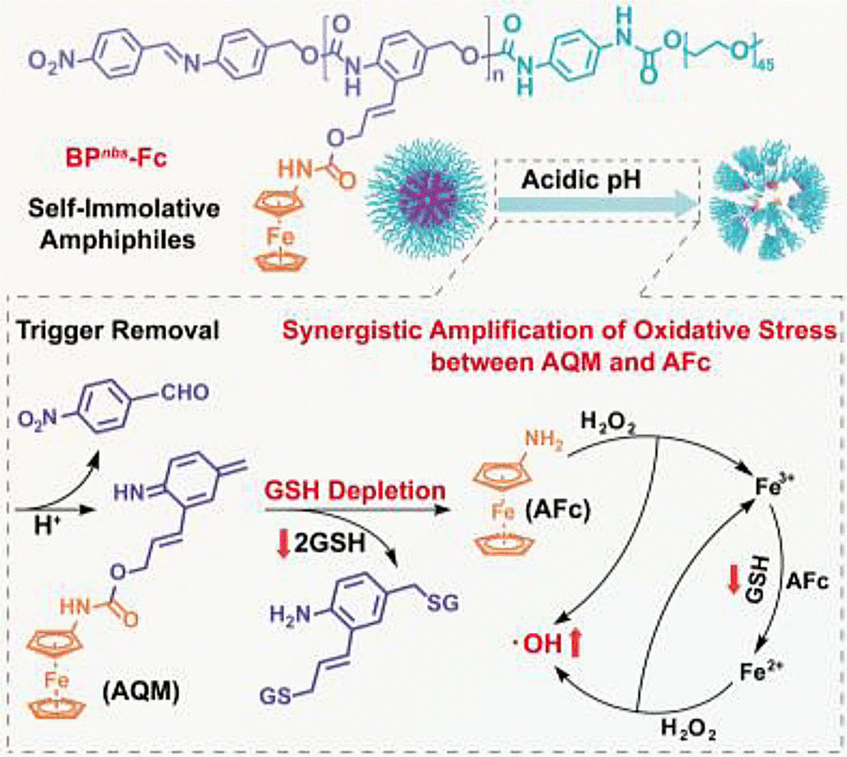 In gesundem Gewebe bleiben die Nanopartikel intakt und damit inaktiv. Erst das viel saurere Milieu von Tumorzellen löst den Prozess der „Selbstopferung“ aus: Die Partikel fallen auseinander und die wasserabweisenden Enden der Polymerketten spalten sich selbsttätig in ihre einzelnen Bausteine. Diese bestehen aus Azachinonmethid-Einheiten, an die über ein Verbindungsstück Aminoferrocene, spezielle Eisen-Komplexe gebunden sind. Es handelt sich dabei um sogenannte Sandwich-Komplexe: Ein Eisenion ist als „Belag“ zwischen zwei flachen aromatischen Kohlenstoff-Fünfringen als „Brotscheiben“ gebunden.