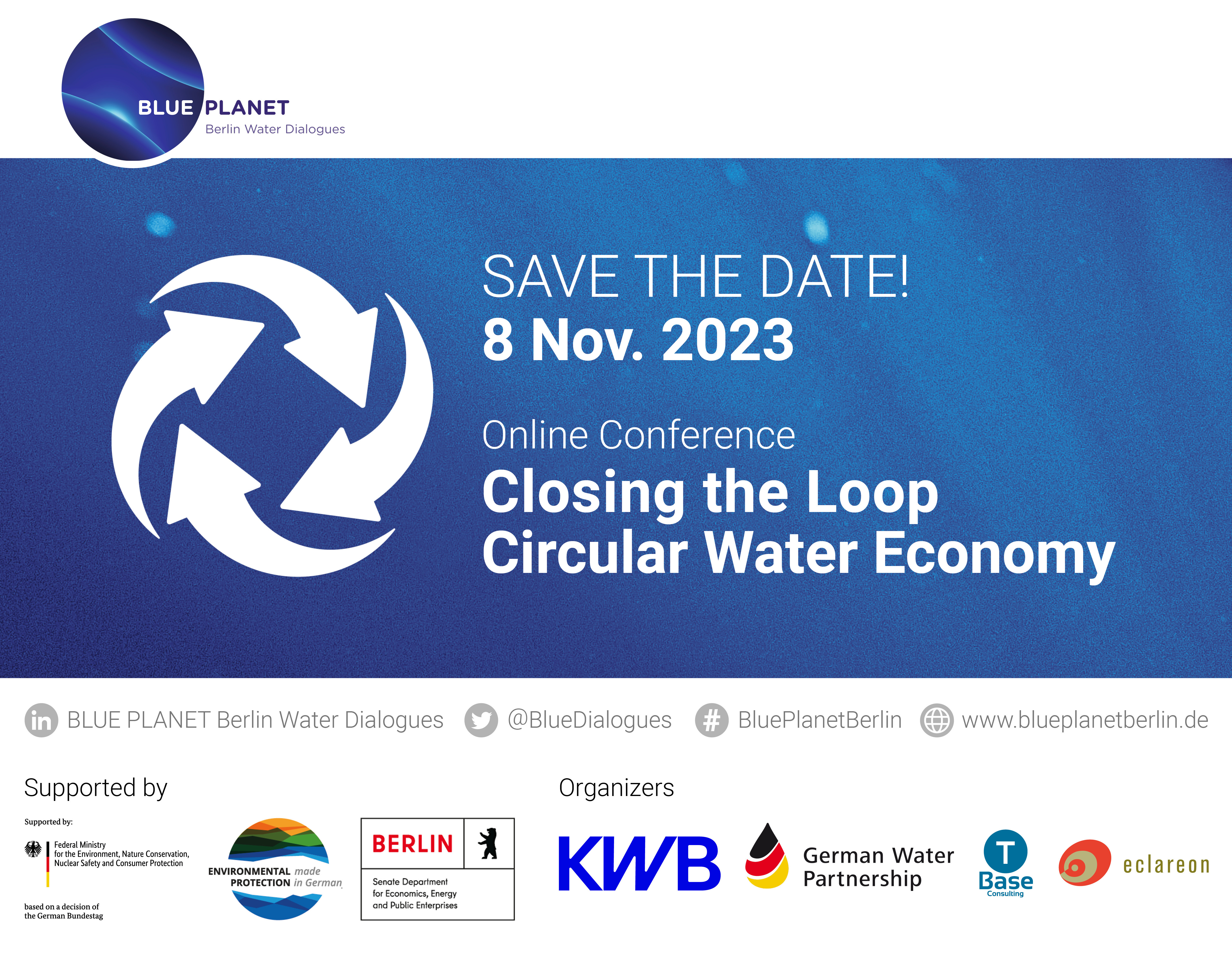 Unter dem Titel „Closing the Loop – Circular Water Economy“ widmen sich die BLUE PLANET Berlin Water Dialogues am 8. November 2023 dem wichtigen Thema der geschlossenen Wasserkreisläufe. Die Folgen des globalen Klimawandels sowie die fortschreitende Ressourcenknappheit verlangen nach neuen, holistischen Wegen des Wassermanagements. Damit diskutiert die Online-Konferenz nach dem Thema Künstliche Intelligenz im vergangenen Jahr ein weiteres Zukunftsthema der Branche. Gefördert wird das international ausgerichtete Veranstaltungsformat durch die Exportinitiative Umweltschutz – GreenTech "Made in Germany" des Bundesministeriums für Umwelt, Naturschutz, nukleare Sicherheit und Verbraucherschutz (BMUV) und die Berliner Senatsverwaltung für Wirtschaft, Energie und Betriebe.