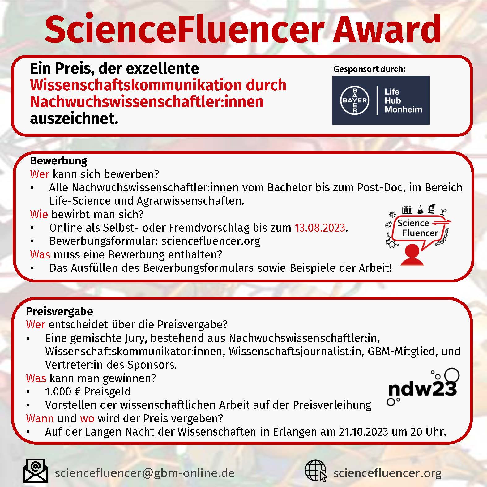 Wie der Physiker und Wissenschaftskommunikator Nicolas Wöhrl sagte: „Um Wissenschaftskommunikation zu betreiben, muss man kein Professor sein!“ Daher hat die Junior-GBM, die Nachwuchsorganisation der Gesellschaft für Biochemie und Molekularbiologie, den ScienceFluencer Award ins Leben gerufen, bei dem die Arbeit von Nachwuchswissenschaftler:innen (Studierende, Promovenden, Postdocs) mit einem mit 1.000 Euro dotierten Preis im Rahmen einer öffentlichen Veranstaltung ausgezeichnet wird.