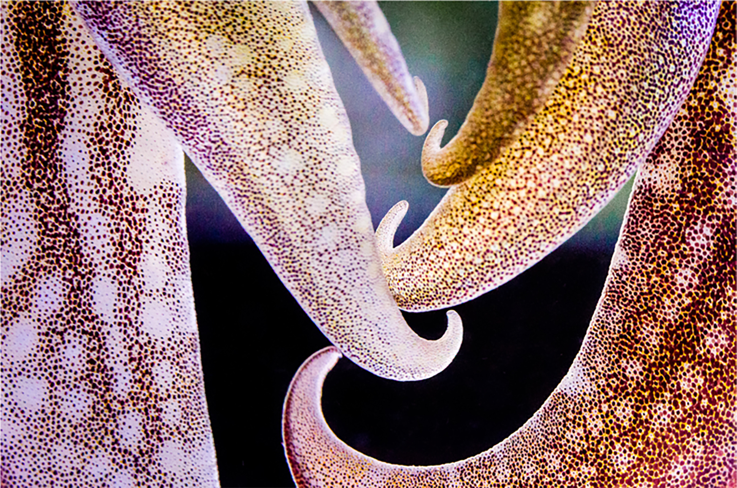 Anschließend untersuchten die Wissenschaftler die Strategien, die die Tiere bei der Erzeugung einer Tarnung anwenden. Kopffüßer verfügen über ein einzigartiges System spezialisierter Organe in ihrer Haut, die so genannten Chromatophoren, die vom Gehirn gesteuert werden. Jedes Chromatophor enthält Pigmentkörnchen - die Pigmente gibt es in drei Farben - in einem zellulären "Beutel", dessen Durchmesser durch eine Reihe winziger radialer Muskeln gesteuert werden kann, die ihrerseits durch spezialisierte Neuronen im Gehirn kontrolliert werden. Jedes Mal, wenn sich die Muskeln zusammenziehen, dehnen sich die Chromatophoren aus, und zwar bis zu einer Größe von etwa 0,3 mm. Jedes Mal, wenn sie sich entspannen, schrumpfen die Chromatophoren zu einem winzigen, unsichtbaren Punkt. Mit Millionen von Chromatophoren in seiner Haut wird der Tintenfisch zu einem Anzeigesystem, ähnlich einem Fernsehbildschirm, aber mit farbigen Pixeln, die in ihrer Größe und nicht in ihrer Intensität variieren können.