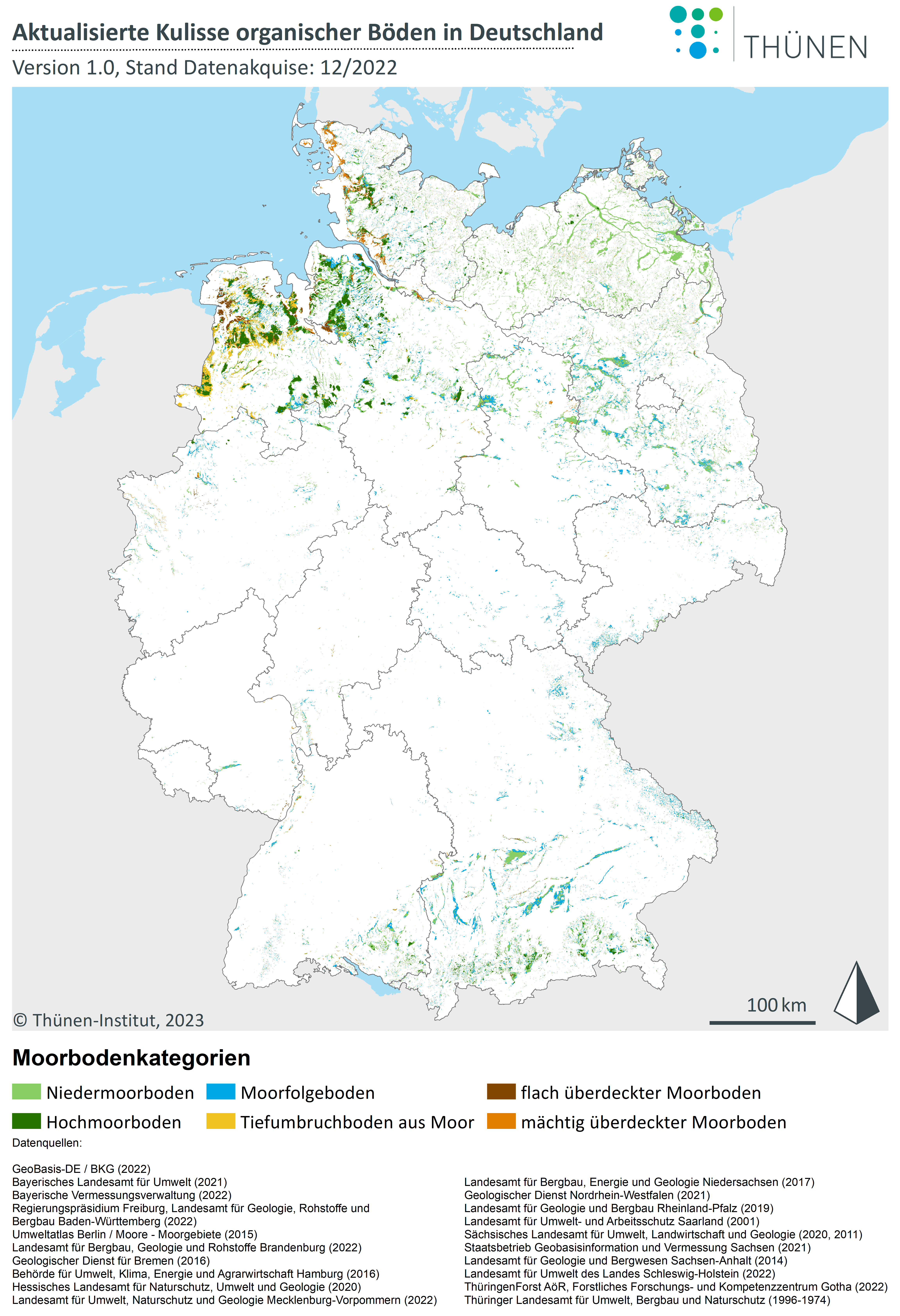 Für eine kartographische Darstellung wurden die Daten aggregiert und Niedermoorböden (47 %), Hochmoorböden (14 %), Moorfolgeböden (24 %), flach und mächtig überdeckte Moorböden (5 % und 3 %) sowie Tiefumbruchböden (6 %) unterschieden. Insgesamt umfasst die aktualisierte Kulisse deutschlandweit 1,93 Millionen Hektar organische Böden.