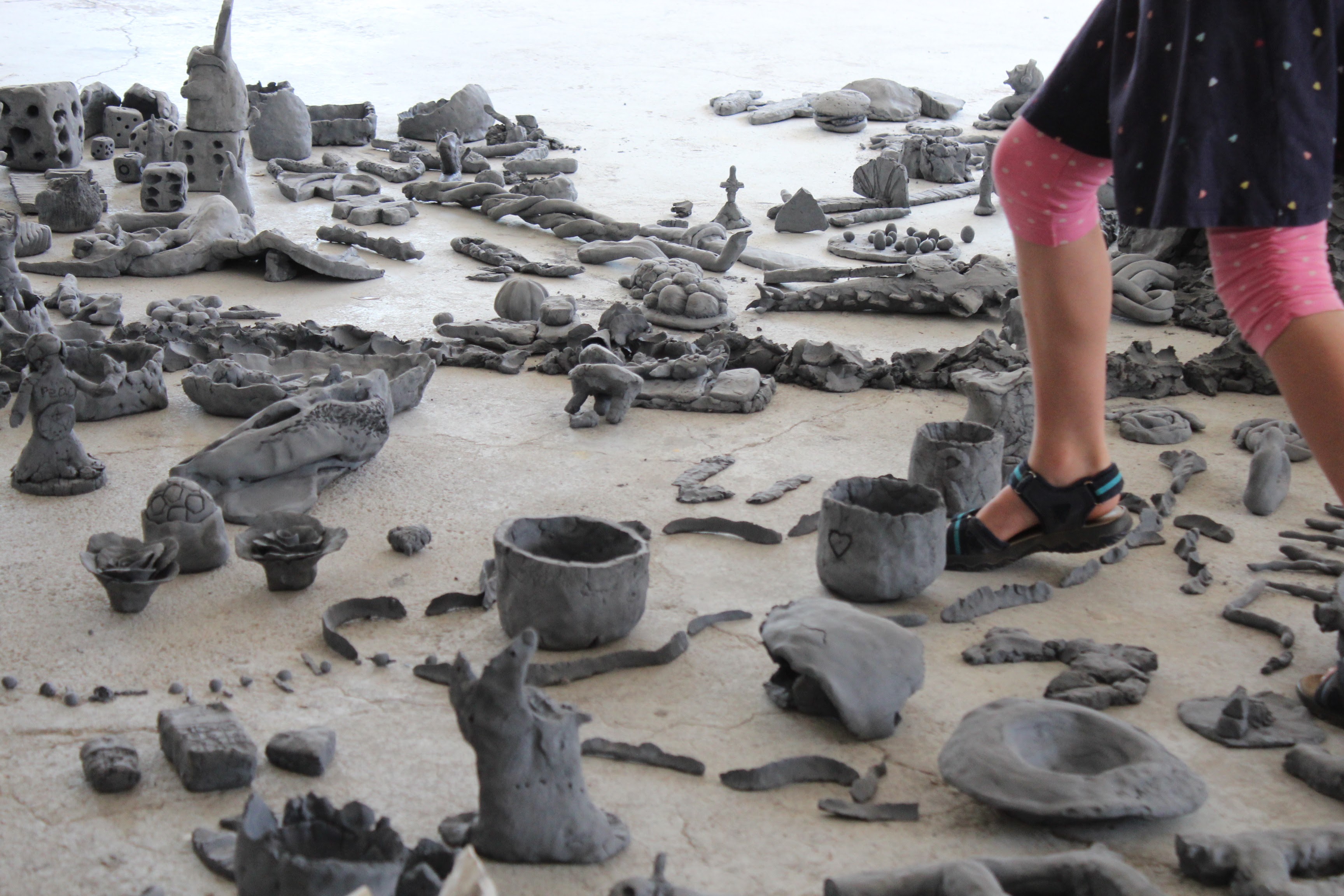 Den Anfang gemacht hatten zu Semesterbeginn die Jüngsten: Die Schüler:innen der Hebel-Grundschule hatten in den Raum gestellt, was ihnen an einem Morgen im April wichtig war, vom eigenen Bett bis hin zur globalen Lage. Dies wurde von verschiedenen hinzukommenden Gruppen (Schüler:innen, Studierende und Erwachsene) aufgegriffen: Formen wurden von anderen Händen wiederholt, Inhalte mit anderen Augen gesehen, Antworten gegeben, neue Fragen aufgeworfen. Gespielt wurde eine „Stille Post“ der Artefakte zwischen Menschen aus unterschiedlichen Lebensaltern und sozialen Kontexten, die nach und nach in ihren keramischen Arbeiten aufeinander reagieren und auf die sich durch die hinzukommenden Arbeiten verändernde Raumsituation Bezug nehmen.