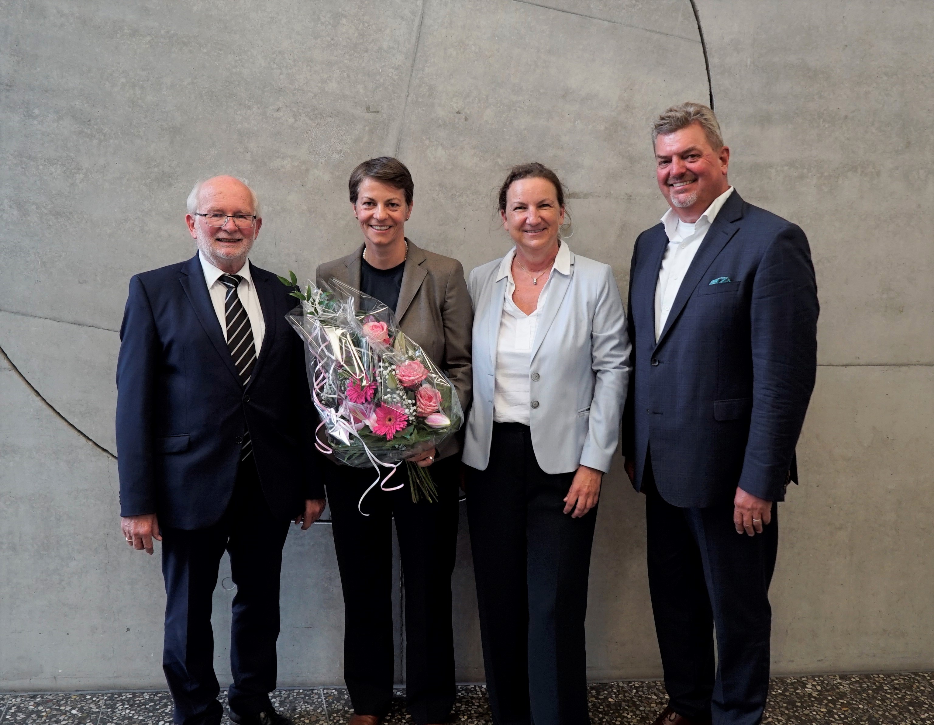 Wechsel in der Hochschulleitung an der HFU: Prof. Dr. Rolf Schofer wird sein Amt im März 2024 an seine neu gewählte Nachfolgerin Dr. Alexandra Bormann übergeben. Rektor Rolf Schofer (links), Hochschulkanzlerin Andrea Linke (2.v.rechts) und der Vorsitzende des Hochschulrats, Dirk Schallock (rechts), gratulierten herzlich zur neuen Aufgabe.