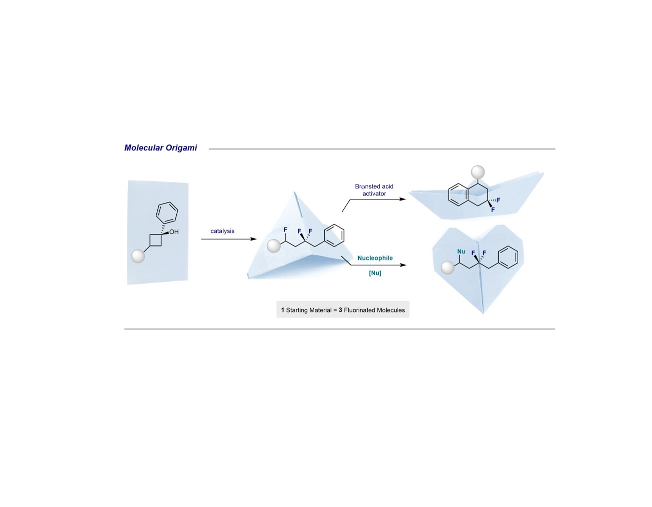 The series of folding steps represents successive reactions. Starting from the simple cyclobutanol starting material ("piece of paper"), an isolable intermediate compound can be produced ("origami hat"). By adding a Brønsted acid activator, an intramolecular cyclisation is triggered, which leads to high value-added tetralin derivatives ("origami boat"). Alternatively, so-called nucleophiles can be introduced by activating the benzylic carbon-fluorine bond ("origami heart").
