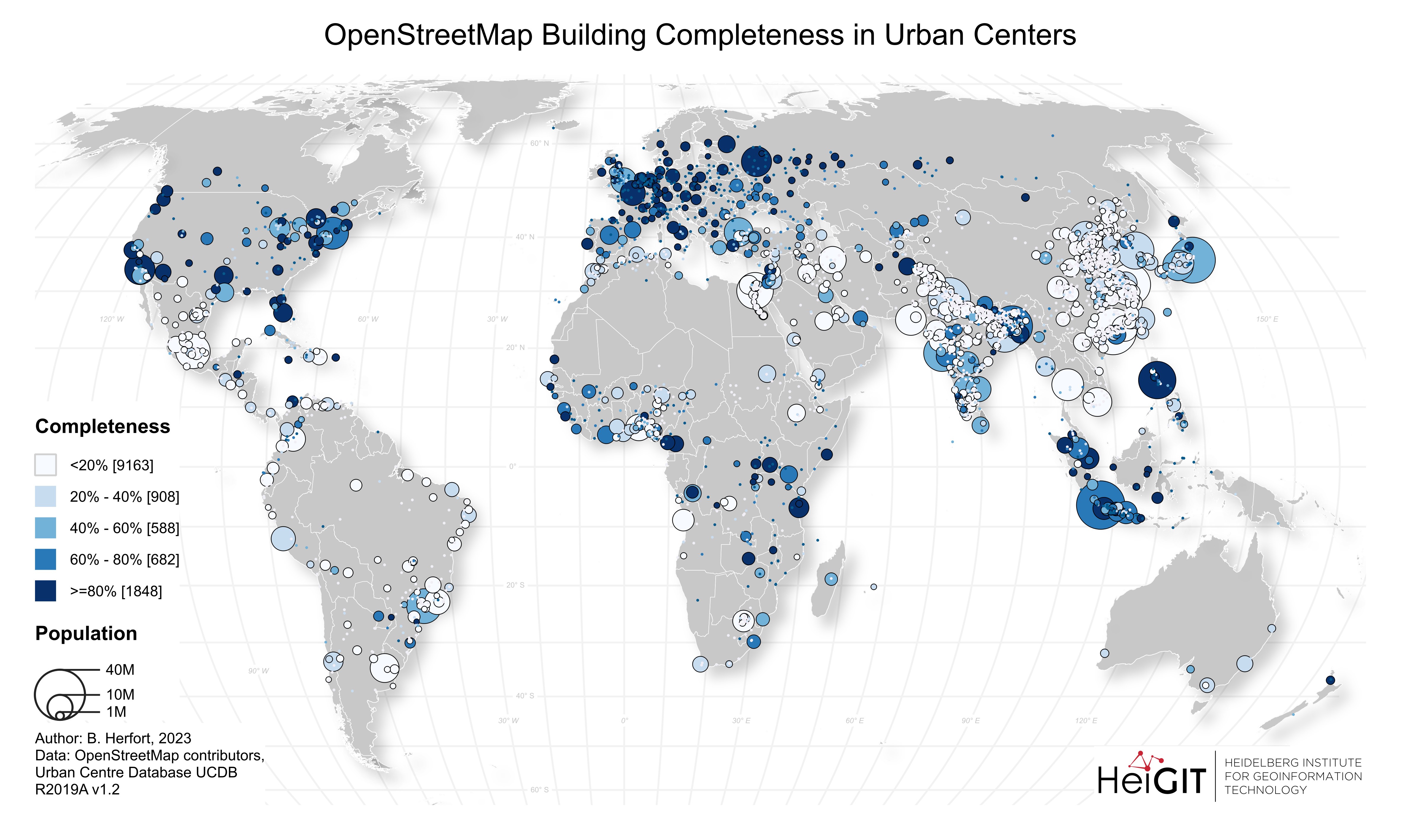 Benjamin Herfort vom Heidelberg Institute for Geoinformation Technology (HeiGIT) hat mit seinen Kollegen Sven Lautenbach, João Porto de Albuquerque, Jennings Anderson und Alexander Zipf einen Artikel im renommierten Journal „Nature Communications“ veröffentlicht. In dem Artikel beschäftigen sie sich mit der weltweit ungleichen Verteilung von OpenStreetMap-Daten, die Auswirkungen auf Forschung und humanitäre Einsätze hat. Sie stellen ihre Ergebnisse zur Vollständigkeit von Gebäudedaten in 13.189 Städten weltweit frei zum Download zur Verfügung.