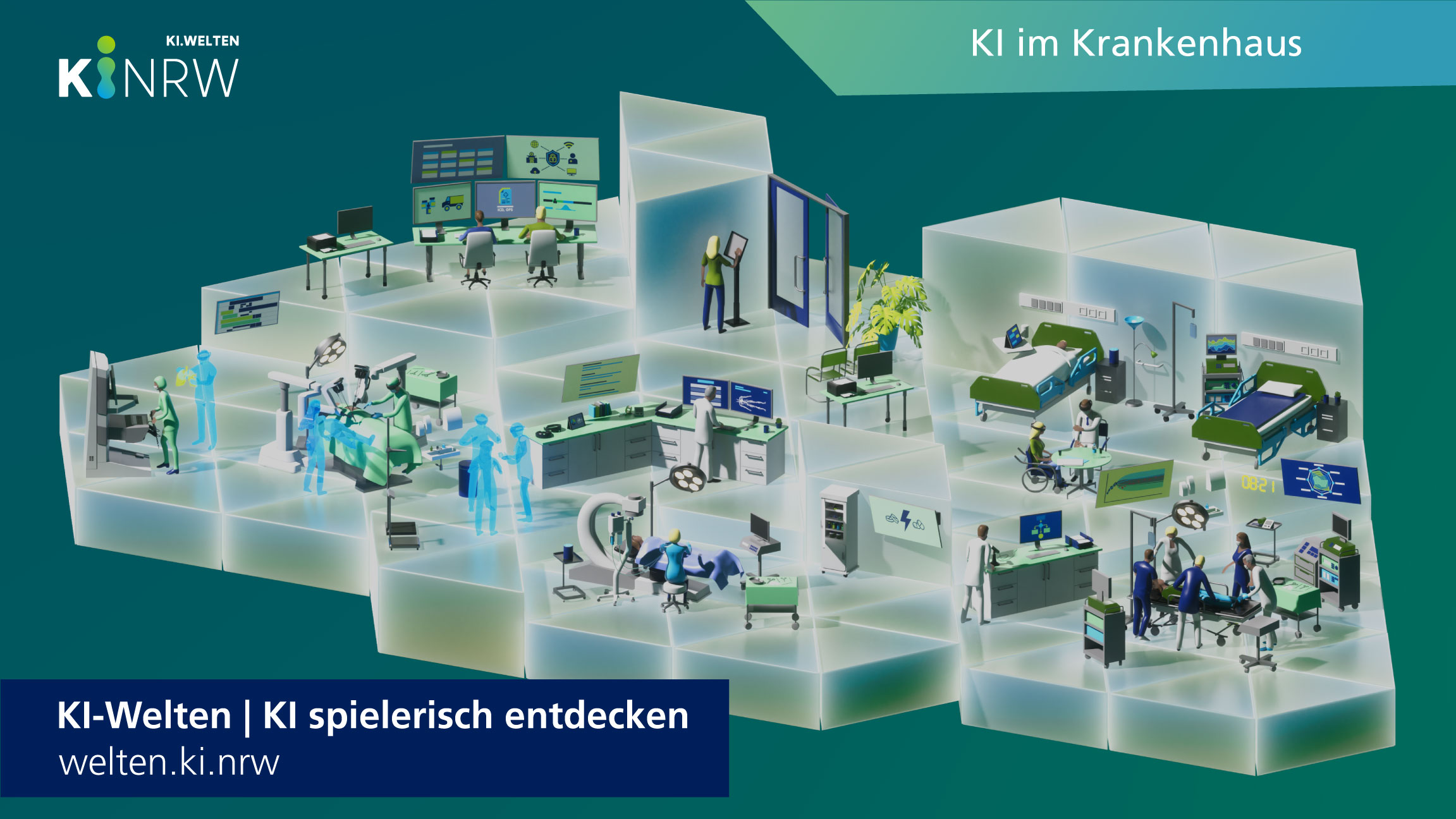 In Krankenhäusern gibt es zahlreiche Einsatzmöglichkeiten für Anwendungen der Künstlichen Intelligenz (KI). Mit dem browserbasierten Tool »KI.Welten« von KI.NRW können Interessierte jetzt ganz intuitiv durch eine multidimensional ausgestaltete Krankenhauslandschaft navigieren und selbst erforschen, wo KI-Systeme schon heute unterstützen oder perspektivisch unterstützen werden. Die insgesamt 28 Anwendungen sind in fünf Themeninseln angeordnet: OP-Saal, Behandlungszimmer, Patient*innenzimmer, Schockraum und Verwaltung. Jeder Anwendungsfall wird in einer Infobox kurz und verständlich erklärt. Eine Filterfunktion bietet zudem eine gezieltere Suche an, um konkrete KI-Schwerpunkte wie »Bilderkennung und -verstehen«, »Sprachtechnologien« oder »Datenanalyse und Prognose« in den KI.Welten hervorzuheben.