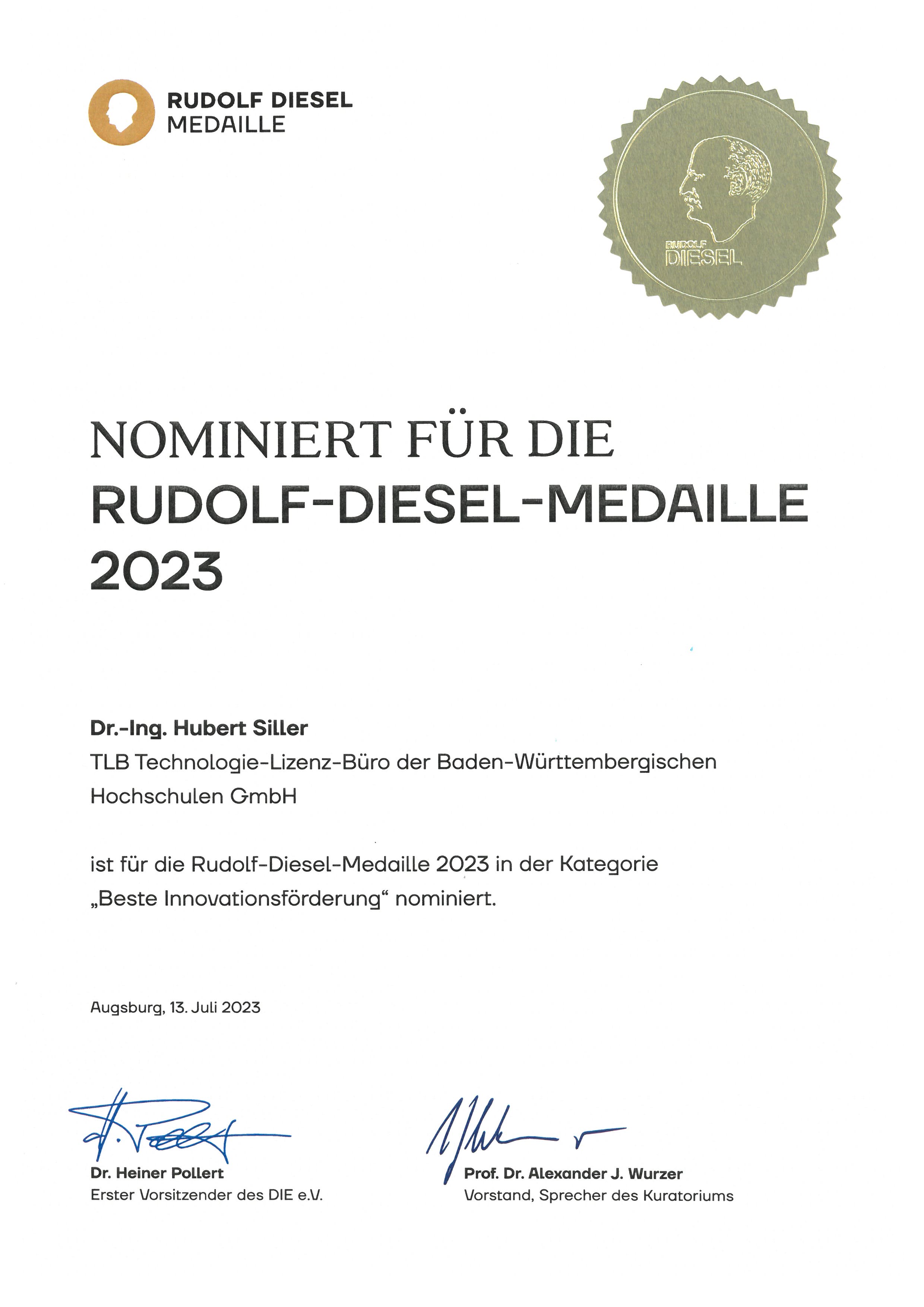 Die TLB GmbH gehört zu den zwölf Firmen und Institutionen, die in diesem Jahr für den renommierten Preis nominiert wurden. Die Patentverwertungsagentur aus Karlsruhe wurde als erste und bisher einzige Patentverwertungsagentur für Hochschulerfindungen für die Rudolf-Diesel-Medaille vorgeschlagen. „Wir fühlen uns sehr geehrt, für unsere Leistungen im Technologietransfer für die Kategorie `Beste Innovationsförderung´ nominiert zu sein“, wie TLB-Geschäftsführer Dr.-Ing. Hubert Siller bei der Galaveranstaltung in Augsburg ausführte. „Für einen solch renommierten Preis nominiert zu werden, bedeutet mir persönlich sehr viel und ist ebenso eine große Auszeichnung für die Teamleistung bei TLB.“