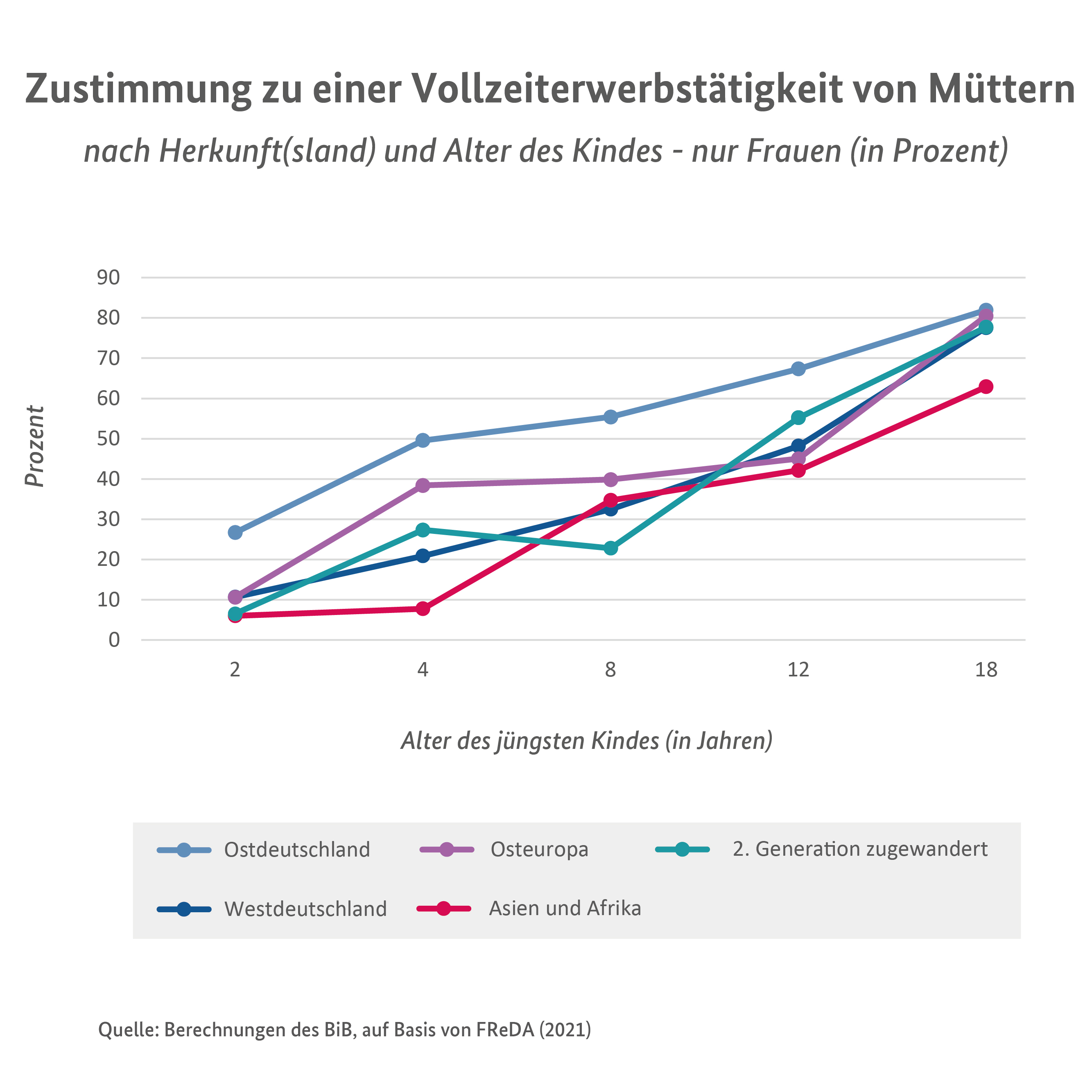 Die Erwerbsbeteiligung von Müttern in Deutschland ist in den vergangenen zwei Jahrzehnten deutlich angestiegen. 2022 gingen 73 Prozent aller Mütter mit minderjährigen Kindern in Westdeutschland und 75 Prozent aller Mütter in Ostdeutschland einer bezahlten Tätigkeit nach, die meisten von ihnen in Teilzeit. Bei der Einstellung zur Müttererwerbstätigkeit zeigen sich aber nach wie vor erhebliche Unterschiede, wie eine neue Studie des Bundesinstituts für Bevölkerungsforschung (BiB) belegt. Demnach ist die Einstellung gegenüber einer Erwerbstätigkeit von Müttern stark vom Alter des jüngsten Kindes und der Herkunft der Eltern abhängig.