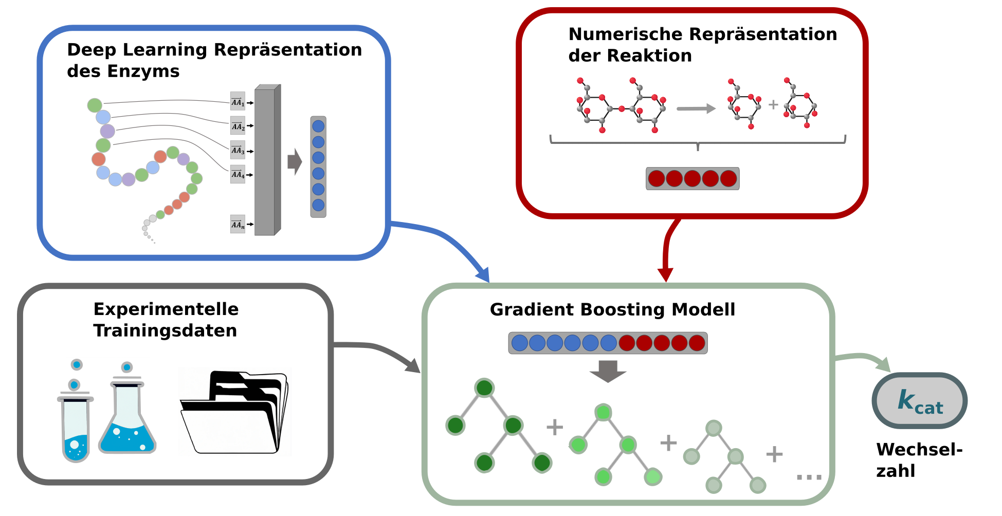 Um ein kcat -Vorhersagemodell zu trainieren, wurden mithilfe von Deep Learning-Modellen Informationen über die Enzyme und die katalysierten Reaktionen in numerische Vektoren umgewandelt. Diese numerischen Vektoren dienten als Eingabe eines Machine Learning-Modells – eines sogenannten Gradient Boosting-Modells –, das die kcat -Werte vorhersagt.