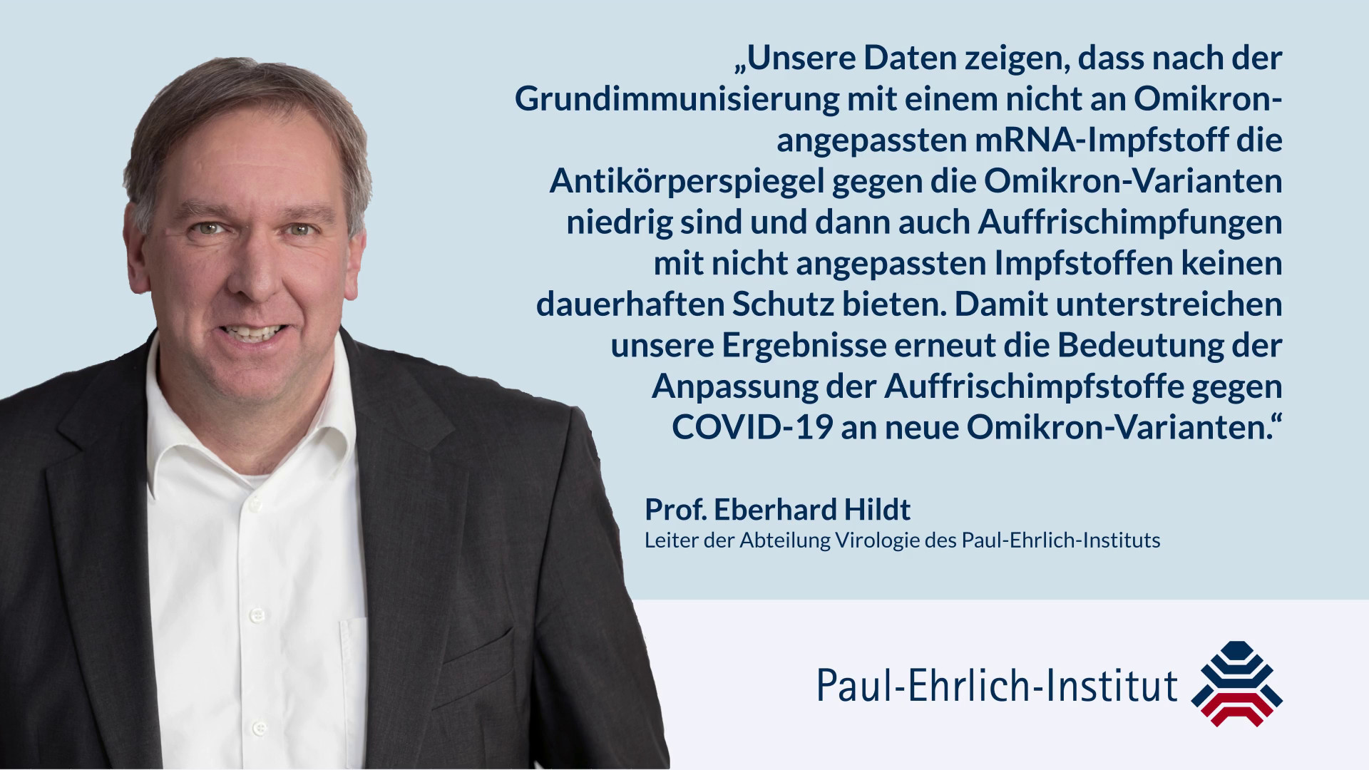 Ein Forschungsteam des Paul-Ehrlich-Instituts unter Leitung von Prof. Eberhard Hildt, Leiter der Abteilung Virologie, hat den Einfluss der ursprünglichen mRNA-Impfstoffe Comirnaty (BioNTech) bzw. Spikevax (Moderna), die noch nicht an die Omikron-Varianten angepasst waren, in einer klinischen Studie auf den Schutz vor Omikron-Varianten durch neutralisierende Antikörper untersucht. Nach der Grundimmunisierung (Comirnaty) waren bei den Studienteilnehmerinnen und Studienteilnehmern nur geringe Blutspiegel (Titer) an neutralisierenden Antikörpern gegen Omikron vorhanden. Auffrischimpfungen (3. und 4. Impfung) mit dem zu diesem Zeitpunkt ebenfalls noch nicht an Omikron-Varianten angepassten monovalenten mRNA-Impfstoff Spikevax führten zwar zu höheren Titern neutralisierender Antikörper gegen die Omikron-Variante. Jedoch fielen die Antikörpertiter auch nach der vierten Impfung (2. Auffrischimpfung) sechs Monate nach der Impfung deutlich ab – wie auch schon zuvor nach der dritten Impfung. Auch hatte die vierte Impfung keinen Einfluss auf die Breite der Antikörper-basierten Immunantwort, die einen Hinweis darüber gibt, inwieweit Schutz vor Infektion mit verschiedenen Virusvarianten besteht.
