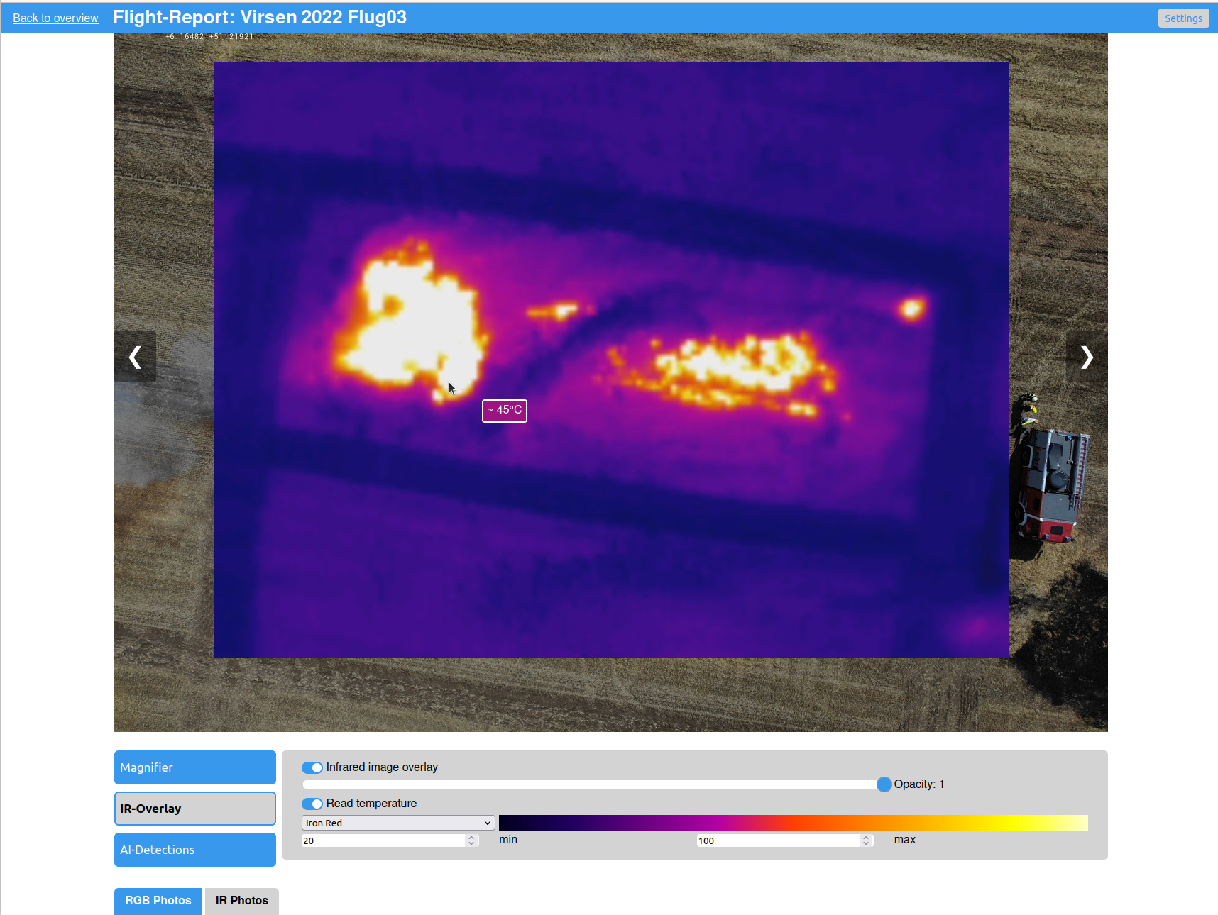Aktuell bietet die Software neben der beschriebenen KI und dem Erstellen von Übersichtskarten viele weitere Funktionen, wie beispielsweise das Auslesen von Temperaturen aus Infrarot-Bildern, das interaktive Erkunden von 360°-Fotos, sowie die Möglichkeit, Vorher-Nachher-Vergleiche der Einsatzstelle mit Satellitenbildern zu betrachten. Darüber hinaus lag ein weiteres Augenmerk auf einer möglichst einfachen Bedienung, da die Systeme nicht nur von Fachleuten, sondern auch durch Einsatzkräfte nutzbar sein sollen.