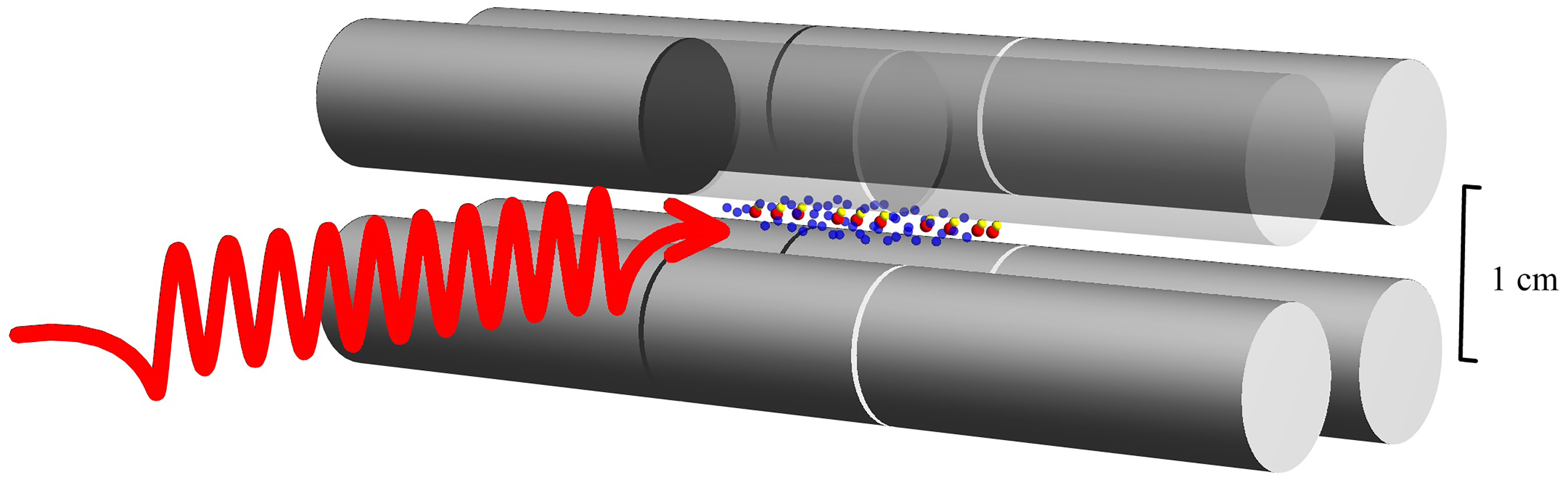 Schema des Experiments: HD+-Molekülionen (gelb-rote Punktpaare) in einer Ionenfalle (grau) werden durch eine Laserwelle (rot) bestrahlt. Dies bewirkt Quantensprünge, wobei sich der Schwingungszustand der Molekülionen ändert. Dieser Prozess entspricht dem Auftreten einer Spektrallinie. Die Wellenlänge der Laserwelle wird präzise gemessen.