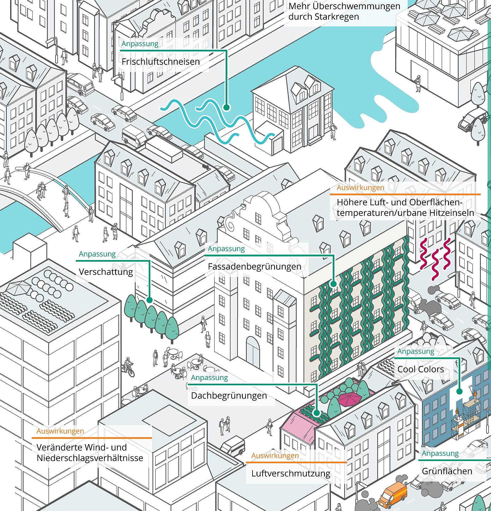 Climate change poses challenges for us all, and city planners are no exception. Researchers expect the incidence of prolonged hot spells, heavy rain and storms to increase in the future. “Densely populated urban areas are particularly susceptible to these kinds of extreme weather events, and they do more than just affect people’s well-being. For individuals that are weaker or experiencing poor health, e.g., people in retirement homes, daycare centers and hospitals, extreme weather events can actually be dangerous,” explains Matthias Winkler, a hygrothermics expert at Fraunhofer IBP. This is why cities and municipalities are working intensively on planning construction initiatives that could help mitigate the consequences of climate change and make city climates manageable to a certain extent, thus maintaining and improving the quality of life in urban areas.