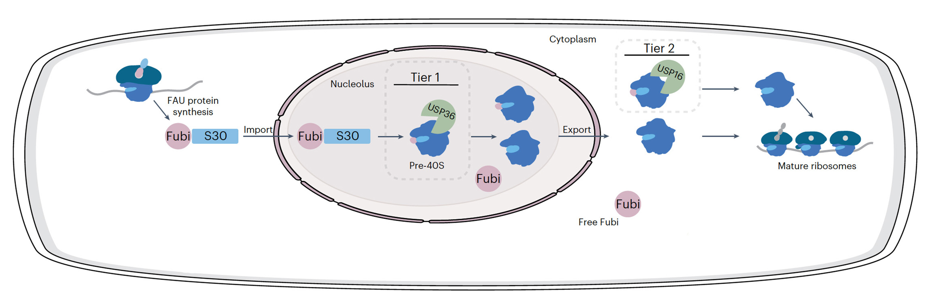 Our work provides new molecular insights into how enzymes can have activities spanning multiple modification systems. Explaining how USP16 and USP36 play a role in ribosomal protein maturation expands our understanding of mechanisms regulating this critical cellular process. Fubi has primarily been studied by scientists from the immunology field, and more recently of the ribosome field, and our work approaching the topic with the Ubiquitin background complements these other works. Together all data converges into a two-tier model for Fubi processing.