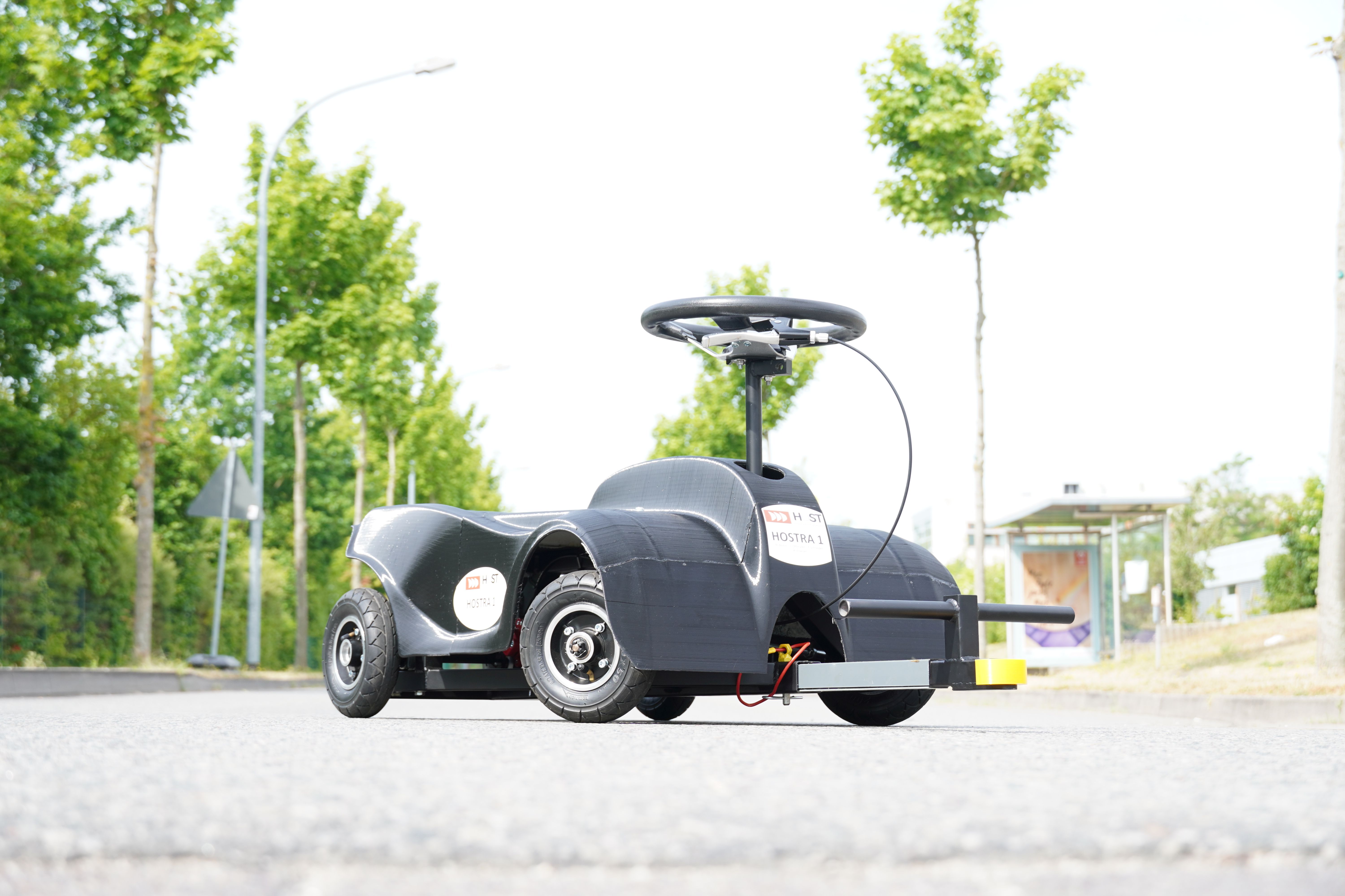 Mit 50 Kilometer pro Stunde, noch gut abbremsbar im Sommerbob bergab die asphaltierte Grindelwald-Strecke in der Schweiz bezwingen – Für diese Anforderungen haben drei Maschinenbau-Studierende ein Rutschauto für Erwachsene konstruiert und gebaut. Den Rahmen dafür bot ihnen im fünften Studiensemester der Kurs 3D-CAD I – Konstruktionssystematik. „Für diesen Kurs schreibe ich Projekte aus, die ich bei Firmen und Kolleg*innen angefragt habe, die die Studierenden dann fachspezifisch erarbeiten“, erklärt Kursleiter Sven Klimaschewski. Das Grindelwald-Rutschauto-Projekt ist eines von gut zehn Projekten gewesen, aus denen die rund 25 Studierenden im Wahlpflichtmodul auswählen konnten. „Wir fanden das direkt ziemlich interessant, ein Projekt, das man auch privat angehen wollen würde“, ordnet Julius Ottmüller ein, der zusammen mit seinen Kommilitonen Timo Schneider und Nils Blohm ein Team bildete. „Zunächst haben sie das Projekt nur auf Papier bearbeitet, immer im Gespräch mit dem Auftraggeber“, erklärt Sven Klimaschewski, „das ist unsere Intention, dass die Studierenden in Firmen reinschnuppern, reale Anforderungen und Hürden kennenlernen“. In diesem Fall trafen seine Studierenden auf keine klassische Firma, sondern auf den Extremsportler Alex Elsässer aus der Schweiz. Die zunächst theoretische Mission: Ein antriebsloses Fahrzeug konstruieren, mit dem er die Grindelwald-Strecke runterheizen könnte – als saisonale Sport-Alternative für Extremrodler*innen, aber auch ausgelegt als potenzielles Freizeitsportgerät für Familien, das an Verleihstationen rausgegeben werden könnte. Der Rollenrodelsport hat Nachwuchsprobleme. Die Idee von Alex Elsässer war, sich über das bekannte Modell aus Fürth – also über ein gewohntes Konzept von Lenkrad und Bremse - an den Sport ranzutasten. „Das Fahrzeug sollte ein Spagat sein zwischen Freizeit- und Sportgerät“, sagt Maschinenbau-Student Timo Schneider.