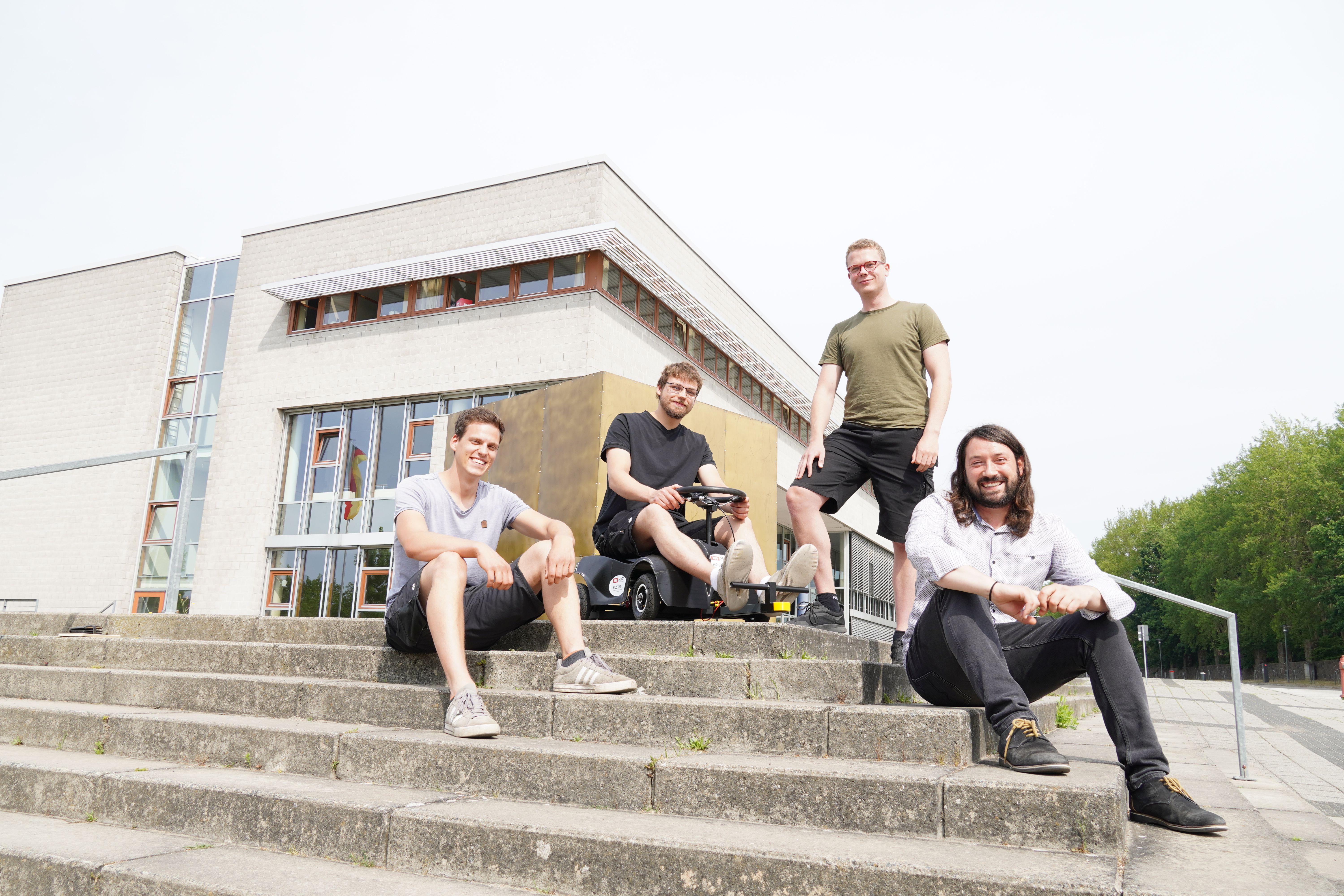 Aber das Ganze funktionierte nicht ohne Weiteres, sondern bot auch Hürden, erinnert sich Nils Blohm. „Das ist ganz normal“, sagt Sven Klimaschewski, „am Computer ist es noch ganz einfach zu konstruieren und in der Realität treten Probleme auf, die einen von der Serienreife abhalten – zumindest erstmal“. In Serie haben die drei aber schon mal vorgedacht. „Wir haben eine Multifunktionalität der Fußraste – in der Länge ist sie auf die Körpergröße des Fahrers einstellbar und auch eine Anhängerkupplung. Vorn gibt es eine Öse. So könnte man bis zu fünf Fahrzeuge hintereinander hängen, um sie zu transportieren“, erklärt Julius Ottmüller. Ein vielversprechender Anfang für die Zeit nach dem Studium, aber in jedem Fall ein Projekt, das jeder der Involvierten sofort wieder angehen würde.