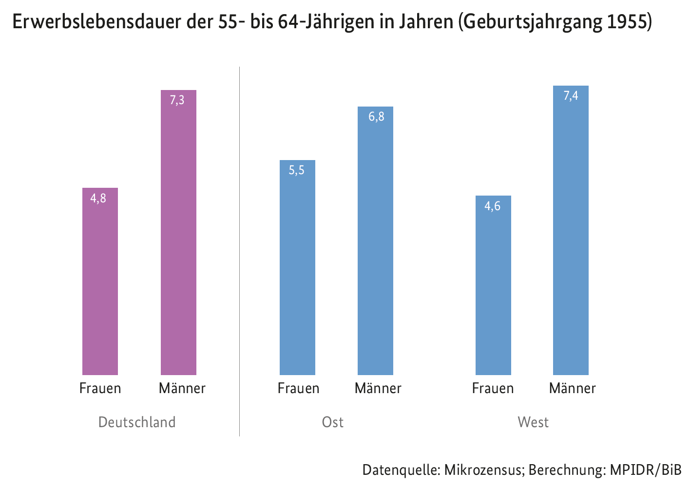 Bei einem Ost-West-Vergleich fallen deutliche Unterschiede zwischen Männern und Frauen auf: Bei den 1955 geborenen Personen hatten westdeutsche Männer mit 7,4 Jahren die höchste Erwerbslebensdauer im Alter zwischen 55 und 64 Jahren. Dagegen war diese bei westdeutschen Frauen mit 4,6 Jahren am niedrigsten. Zwischen den beiden Extremen lagen ostdeutsche Männer mit 6,8 Jahren und ostdeutsche Frauen mit 5,5 Jahren. „Die Unterschiede zwischen west- und ostdeutschen Männern gehen hauptsächlich auf abweichende Erwerbstätigenquoten zurück“, sagt Elke Loichinger, Forschungsgruppenleiterin am BiB. „Die Differenzen bei den Frauen erklären sich hingegen vorrangig durch Unterschiede bei den geleisteten Arbeitsstunden.“ So haben ältere westdeutsche Frauen zwar ähnlich hohe Erwerbstätigenquoten wie ältere ostdeutsche Frauen, letztgenannte absolvieren aber durchschnittlich deutlich mehr Stunden pro Woche. Hier scheint sich positiv auszuwirken, dass in den betrachteten Generationen ostdeutsche Frauen schon von einer gut ausgebauten Kinderbetreuung profitieren konnten, während viele westdeutsche Frauen mit der Mutterschaft ihre Arbeitszeit erheblich reduzierten.