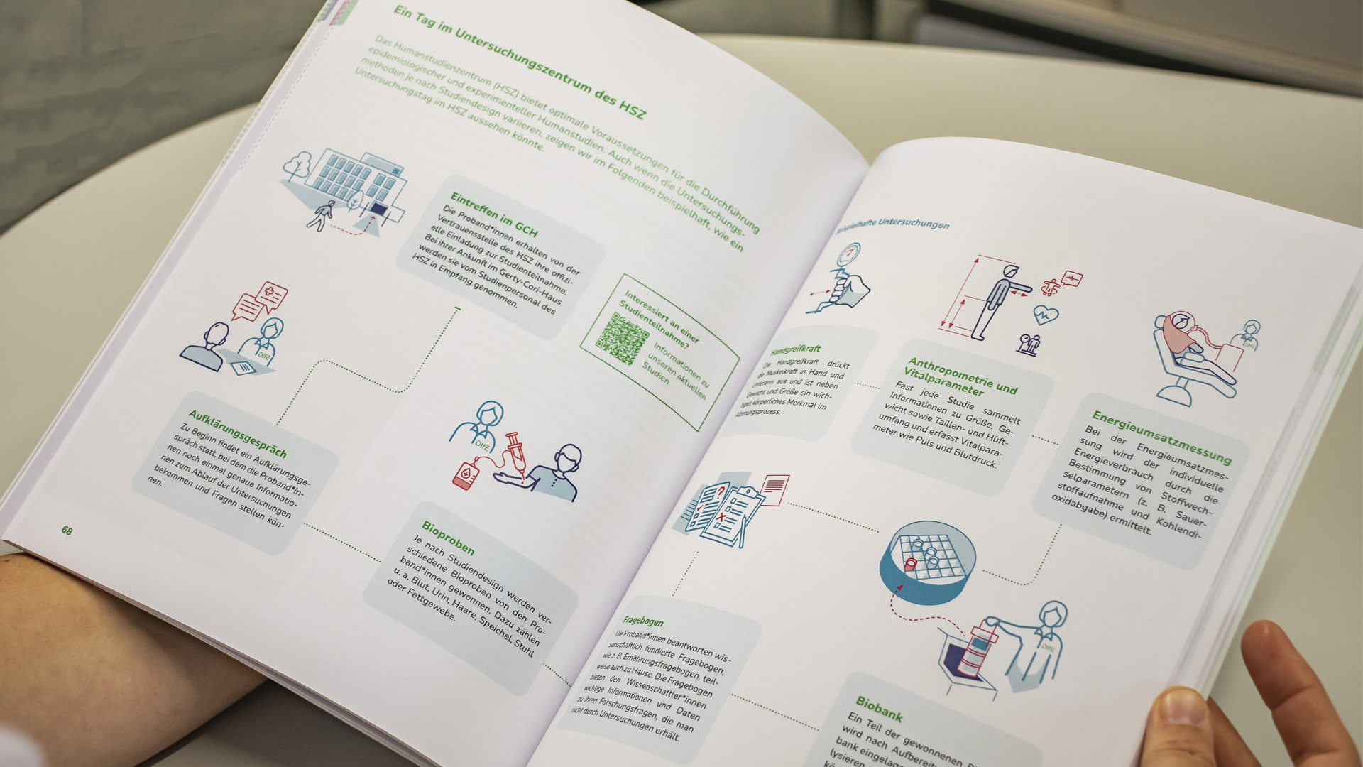 Ein weiterer Themenschwerpunkt ist die Vorstellung des im September 2021 eröffneten Gerty-Cori-Hauses. Anhand einer Infografik erfahren die Leser*innen unter anderem, wie Proband*innen einen Untersuchungstag im Humanstudienzentrum des DIfE erleben. Weiterhin wird am Beispiel der DIfE-Risiko-Tests verdeutlicht, wie die gewonnenen Studiendaten Anwendung in der Praxis finden.