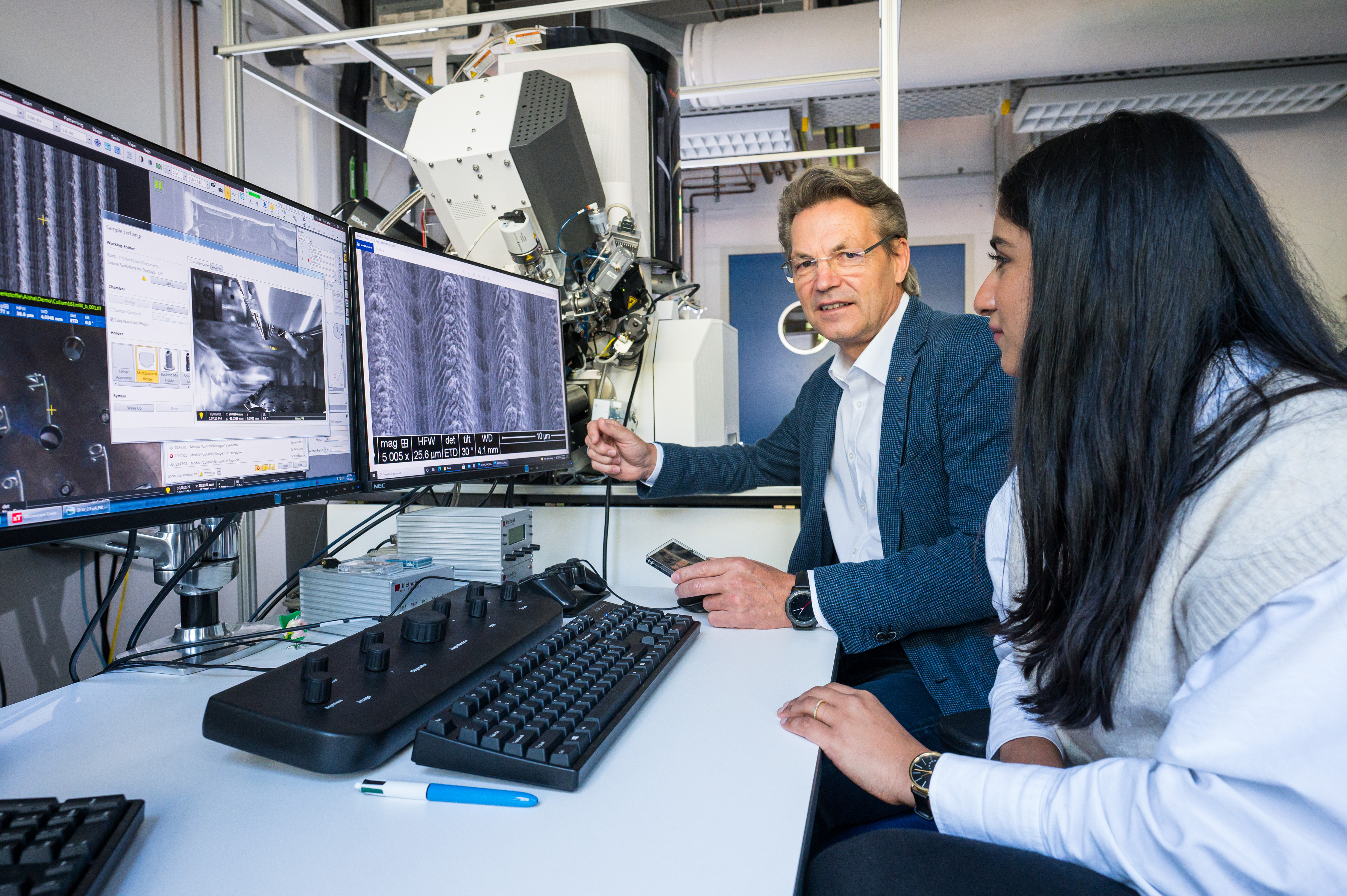 Insbesondere aber auch die innere Struktur – das sogenannte Gefüge – von Hochleistungswerkstoffen wie Stahl steht bei Mücklich im Mittelpunkt der Forschung. Gefüge sind auf der Mikro- und Nanoskala sehr individuell. Vom jeweiligen Gefüge hängt ab, welche Eigenschaften ein Material hat. Mücklich hat sich auf die räumliche Analyse von Gefügen spezialisiert und setzt hierfür verschiedene dreidimensionale Verfahren ein, die er und sein Forschungsteam beständig weiter verfeinern und aufeinander abstimmen. Die zielgenaue Ionenstrahlpräparation kombiniert mit hochauflösender Elektronenmikroskopie sowie Nano- und Atomsonden-Tomographie kommen hierbei zum Einsatz. Die 3D-Informationen fügen die Forscher am Computer bis hin zum einzelnen Atom zum exakten räumlichen Abbild zusammen.