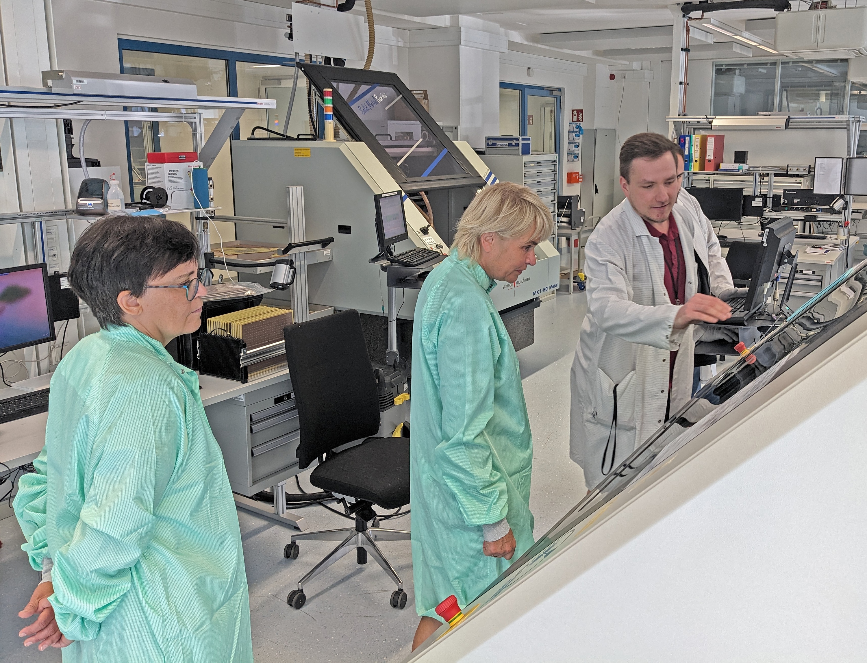 Bei einer gemeinsamen Laborbesichtigung nach Vertragsverzeichnung in unserer Sub-stratlinie und im Reinraum sind sich die Teilnehmenden an dem Termin einig: So darf Nachwuchsförderung aussehen und genügend Arbeitsplätze kann das Fraunhofer IZM künftig für Studierende und auch Auszubildende zur Verfügung stellen. Alle Beteiligten sehen positiv auf die gesteckten Pläne und hoffen noch mehr MINT-begeisterte Schüler*innen zu erreichen.