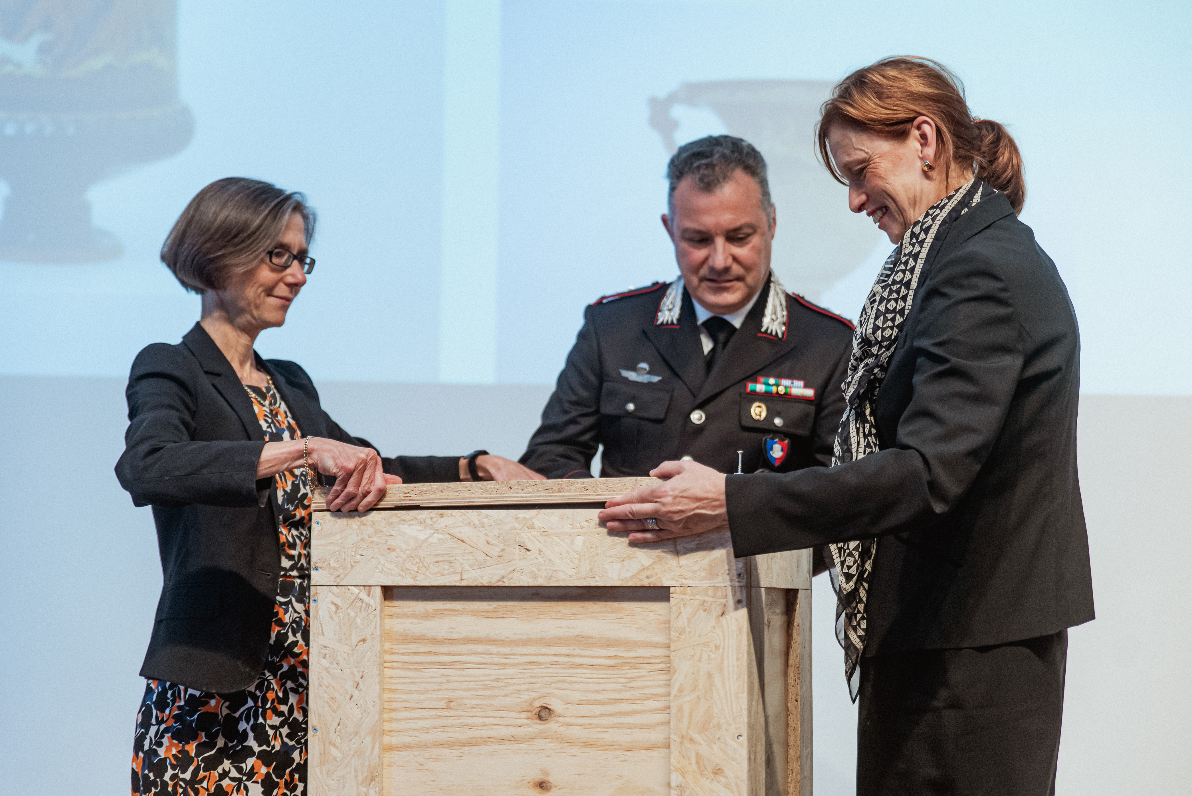 Die letzte Versandkiste für den Transport nach Italien wurde symbolisch von CAU-Präsidentin Professorin Simone Fulda, Oberstleutnant Paolo Salvatori der italienischen „Tutela Patrimonio Culturale" und Kulturministerin Karin Prien ver-schlossen.