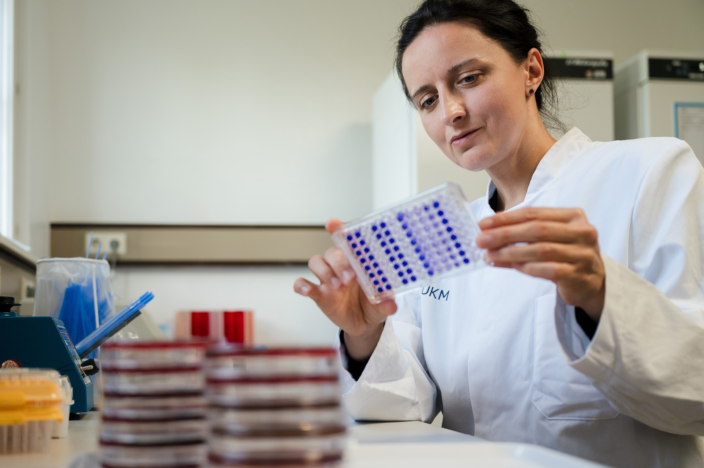 Die Arbeitsgruppe um Prof. Barbara Kahl hat kürzlich eine besondere Form mukoider S. aureus-Isolate entdeckt, die übermäßig viel Biofilm produzieren und eine genetische Besonderheit aufweisen (es fehlen fünf Bausteine in der DNA eines bestimmten Bereiches, wodurch die überschießende Biofilmbildung verursacht wird: 5bp-Deletion). Diese S. aureus-Form tritt insbesondere bei Menschen mit Mukoviszidose auf, sie ist aber hinsichtlich ihrer klinischen Bedeutung noch nicht charakterisiert – möglicherweise verschaffen sich die Bakterien hierdurch einen Überlebensvorteil, der es ihnen ermöglicht, langfristig in der Lunge von CF-Betroffenen zu verbleiben. Hier setzt die Arbeit von Christine Rumpf an, mit dem Ziel, die molekularen Mechanismen und genetischen Veränderungen zu untersuchen, die zur Entstehung von mukoiden und übermäßig Biofilm-bildenden S. aureus-Formen führen. Außerdem soll geklärt werden, welche Umgebungsbedingungen (z. B. viel/wenig Salz, verschiedene pH-Werte, Anwesenheit von P. aeruginosa, Anwesenheit von Immunzellen etc.) dieses Verhalten auslösen und wie diese S. aureus-Formen mit den Lungenepithelzellen und Immunzellen interagieren.