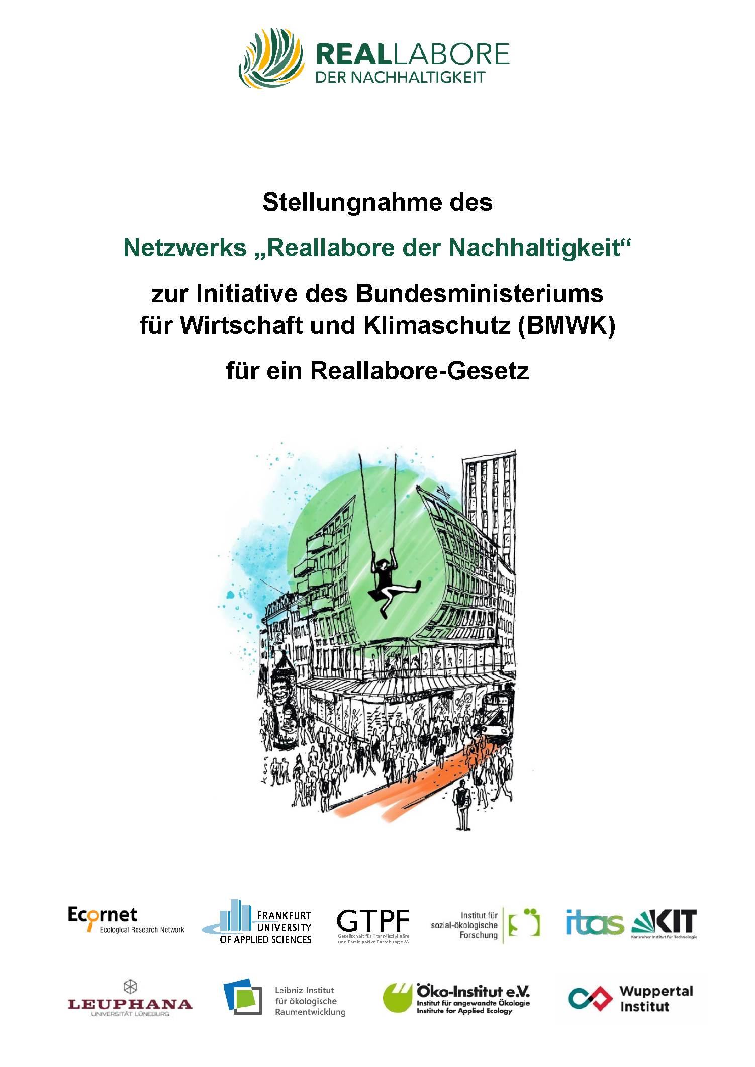 Herausgebende Institutionen der Stellungnahme zur Initiative des Bundesministeriums für Wirtschaft und Klimaschutz (BMWK) für ein Reallabore-Gesetz sind: Ecological Research Network (Ecornet), Frankfurt University of Applied Sciences (FRA UAS), Leibniz-Institut für ökologische Raumentwicklung (IÖR), ISOE – Institut für sozial-ökologische Forschung, Karlsruher Institut für Technologie (KIT), Leuphana Universität Lüneburg, Öko-Institut, Wuppertal Institut sowie weitere Akteure des Netzwerkes „Reallabore der Nachhaltigkeit“.