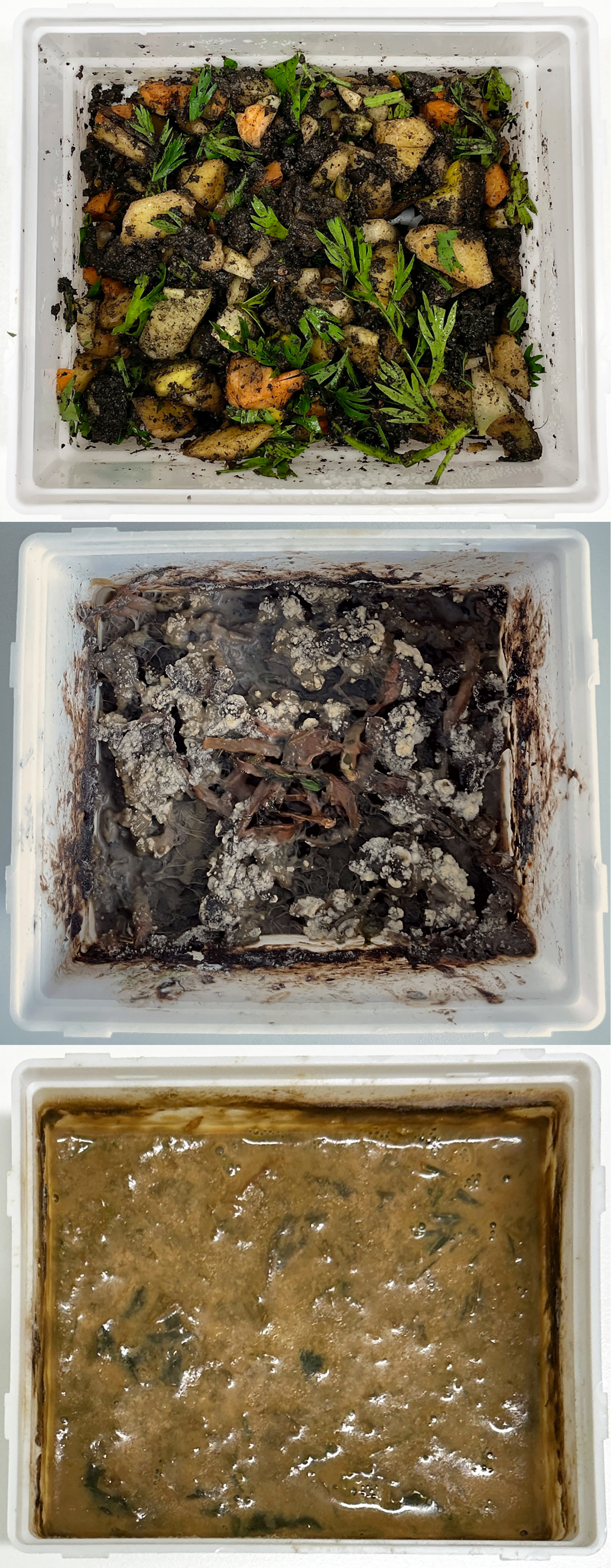 Bildunterschrift: In den naturnahen Kompost-Mesokosmen (hier nach 0, 100 und 600 Tagen, von oben nach unten) konnten die Forschenden die Anpassung von Wirtslebewesen und Mikroorganismen an komplexe Umweltbedingungen über einen langen Zeitraum beobachten.