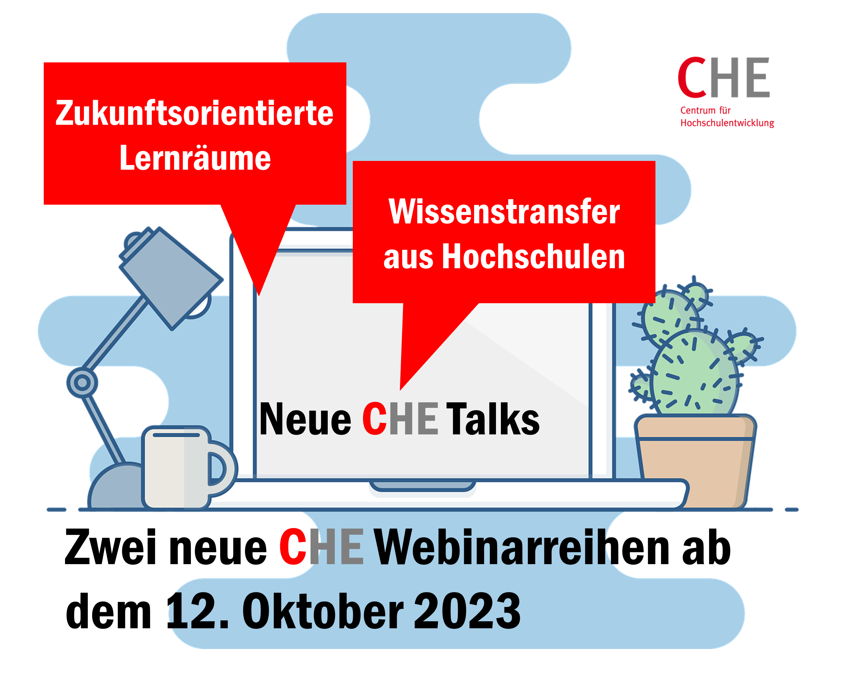 Nach der Premierenstaffel zu Innovationen in der Lehrkräftebildung (Frühjahr 2023) widmet sich das CHE Centrum für Hochschulentwicklung nun zwei weiteren Themen. Wie gewohnt bieten im Webinarformat „CHE Talks“ hochkarätige Referent*innen allen Interessierten anregende Einblicke und Handlungsempfehlungen. In jeweils einstündigen, kostenfreien Webinaren zur Mittagszeit werden aktuelle Herausforderungen, praktische Lösungsansätze und Beispiele guter Praxis vorgestellt und diskutiert.