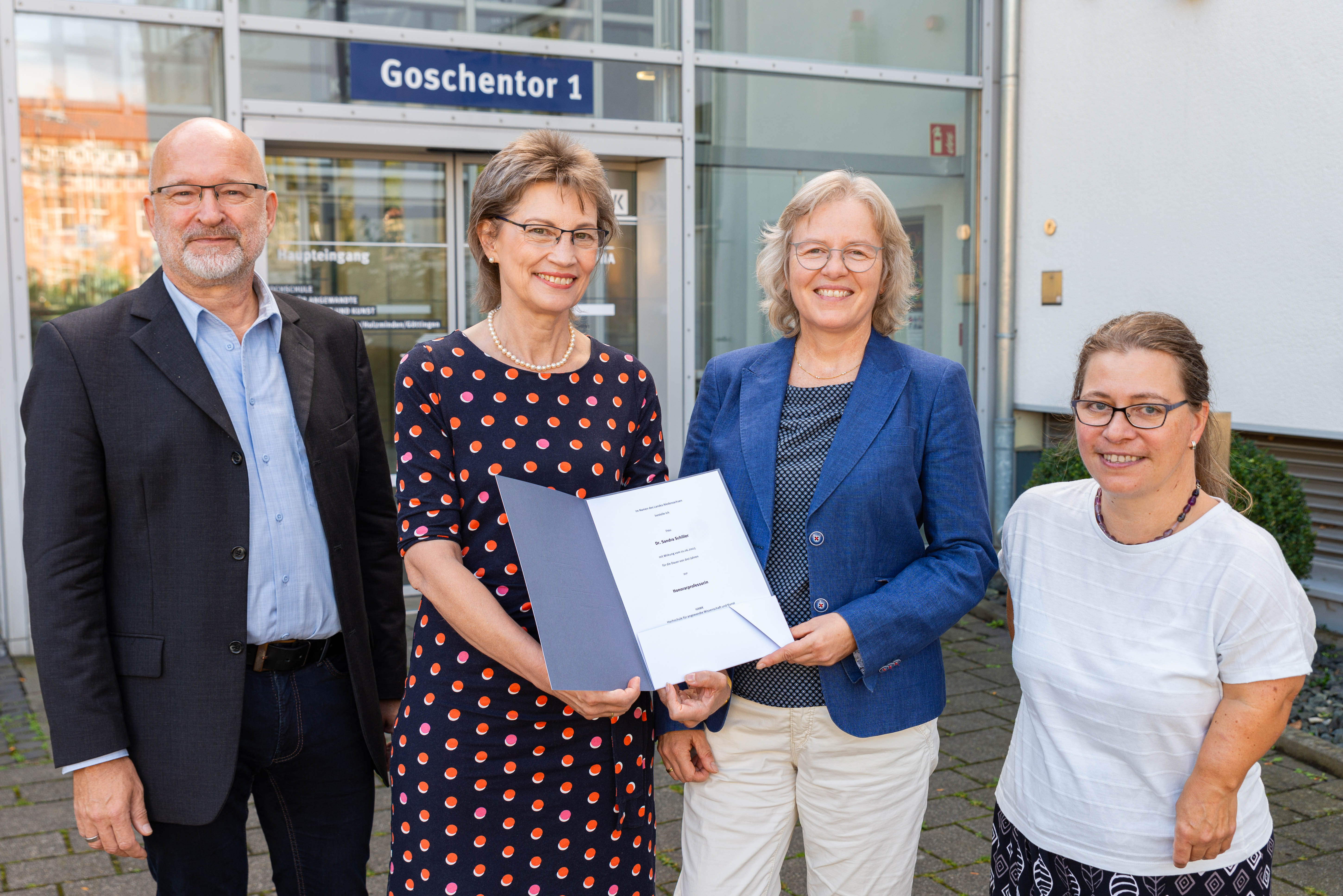 „Ab jetzt darfst Du Dich Professorin nennen“, so Scholz-Bürig, „das ist zum einen eine Wertschätzung für Deine über mehrere Jahrzehnte geleistete exzellente Forschung und Lehre an der HAWK, zum anderen aber jetzt auch eine strukturelle Erleichterung, da viele Forschungsanträge und Kooperationen – auch besonders international - noch immer erfolgversprechender sind, wenn der Titel einer Professur geführt und damit auch formal ‚Augenhöhe‘ hergestellt wird.“ Abgehalten habe das Sandra Schiller vorher allerdings auch nicht, so Scholz-Bürig anerkennend.