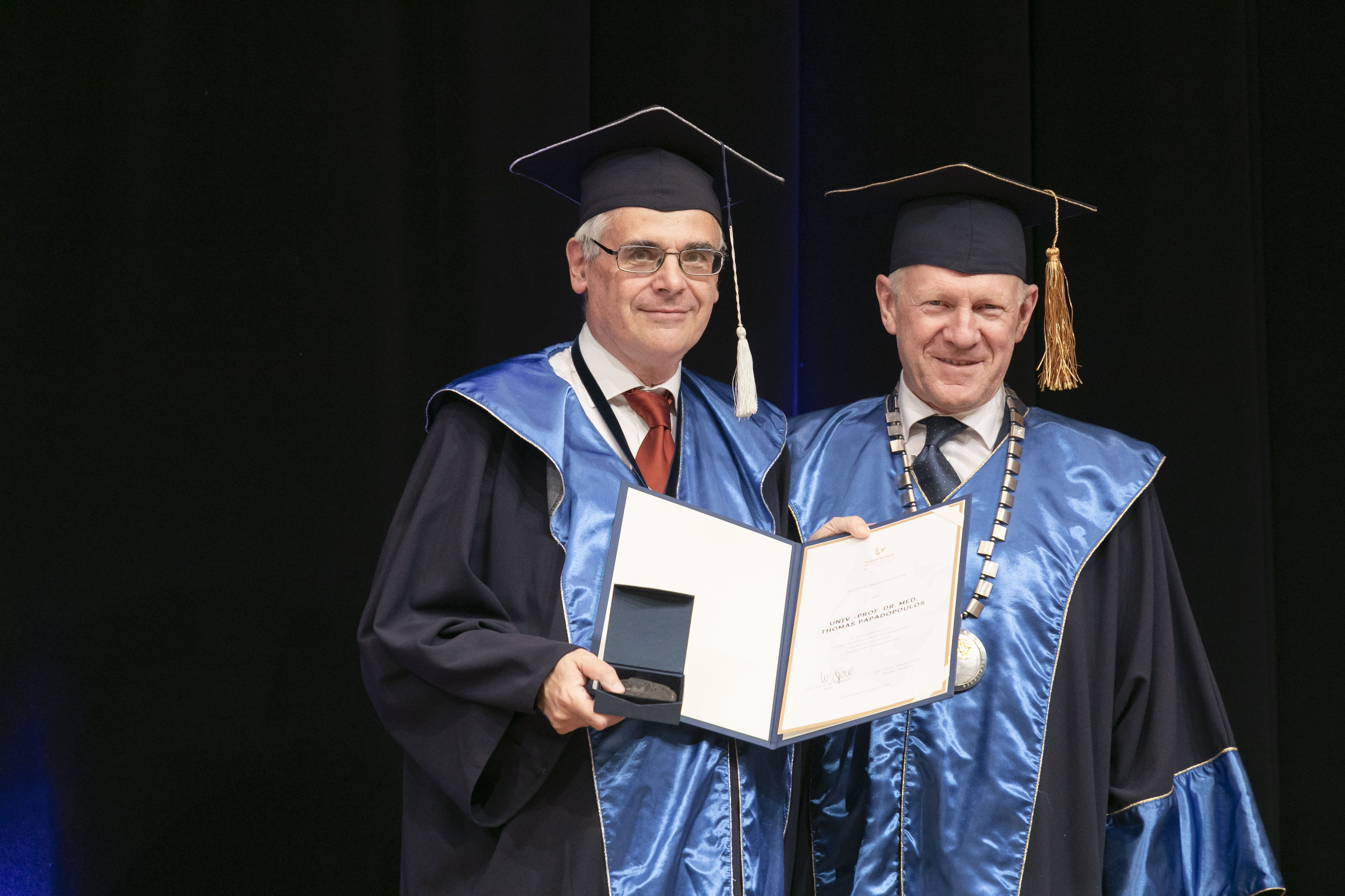 Die inzwischen fünfte Abschlussfeier der PMU Nürnberg war auch für Prof. Dr. Thomas Papadopoulos ein besonderer Meilenstein. Der Dekan für Lehre und klinische Angele-genheiten, der seit der Gründung der PMU vor fast zehn Jahren mit Herzblut und Enga-gement dabei war, wurde mit Standing Ovations und einer Klavier-Version von David Bo-wies Song „Heroes“ verabschiedet. Der Medizinische Direktor des Klinikums Nürnberg, Univ.-Prof. Dr. Bert Reichert, bedankte sich in seiner Rede für Papadopoulos‘ Pionierar-beit, seine Ausdauer und Beharrlichkeit. „Sie waren ein Glücksfall für die PMU Nürnberg“, so Reichert. Nachfolgen im Amt wird Univ.-Prof. Dr. med. Stefan Knop, Chefarzt der Klinik für Innere Medizin mit den Schwerpunkten Onkologie und Hämatologie.