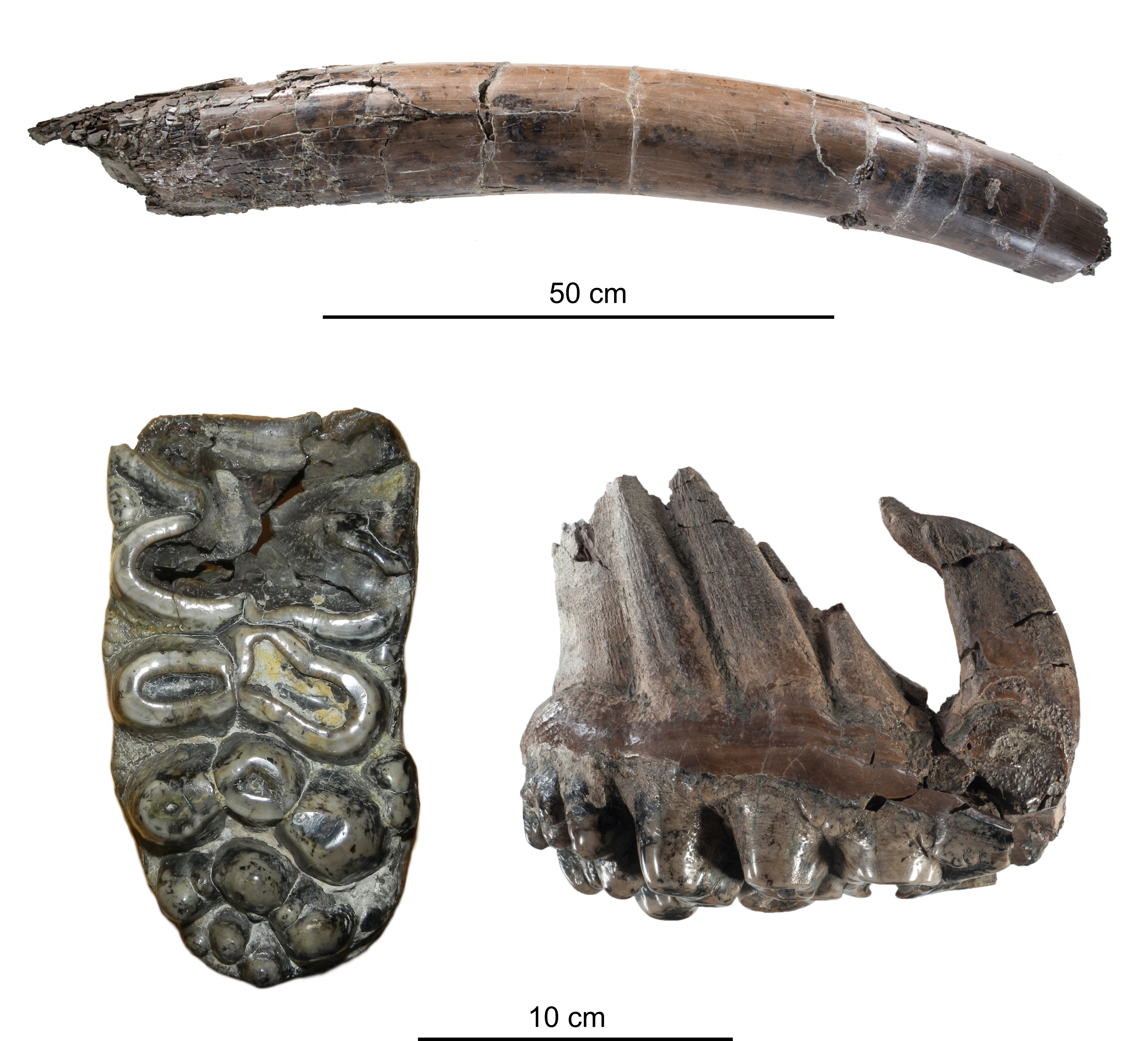 Die zweite Rüsseltierart der Hammerschmiede ist der elefantenartige Tetralophodon longirostris. Diese höckerzahntragenden Rüsseltiere unterscheiden sich von echten Elefanten und Mammuts auch durch den Besitz von Stoßzähnen sowohl im Ober- wie auch im Unterkiefer. Das bedeutendste Exemplar der vier Individuen aus der Hammerschmiede ist ein Teilskelett eines ausgewachsenen Bullen, welches bereits vor mehr als 40 Jahren durch die beiden Allgäuer Privatsammler Sigulf Guggenmos und Manfred Schmid ausgegraben wurde. „Aufgrund der mächtigen Stoßzähne sowie der Größe und des Abnutzungsgrads seiner Backenzähne vermuten wir, dass es ein Männchen im Alter zwischen 37 und 48 Jahren war. Sein Lebendgewicht waren gut zehn Tonnen und die Schulterhöhe etwa 3,5 Meter“, erklärt George Konidaris.