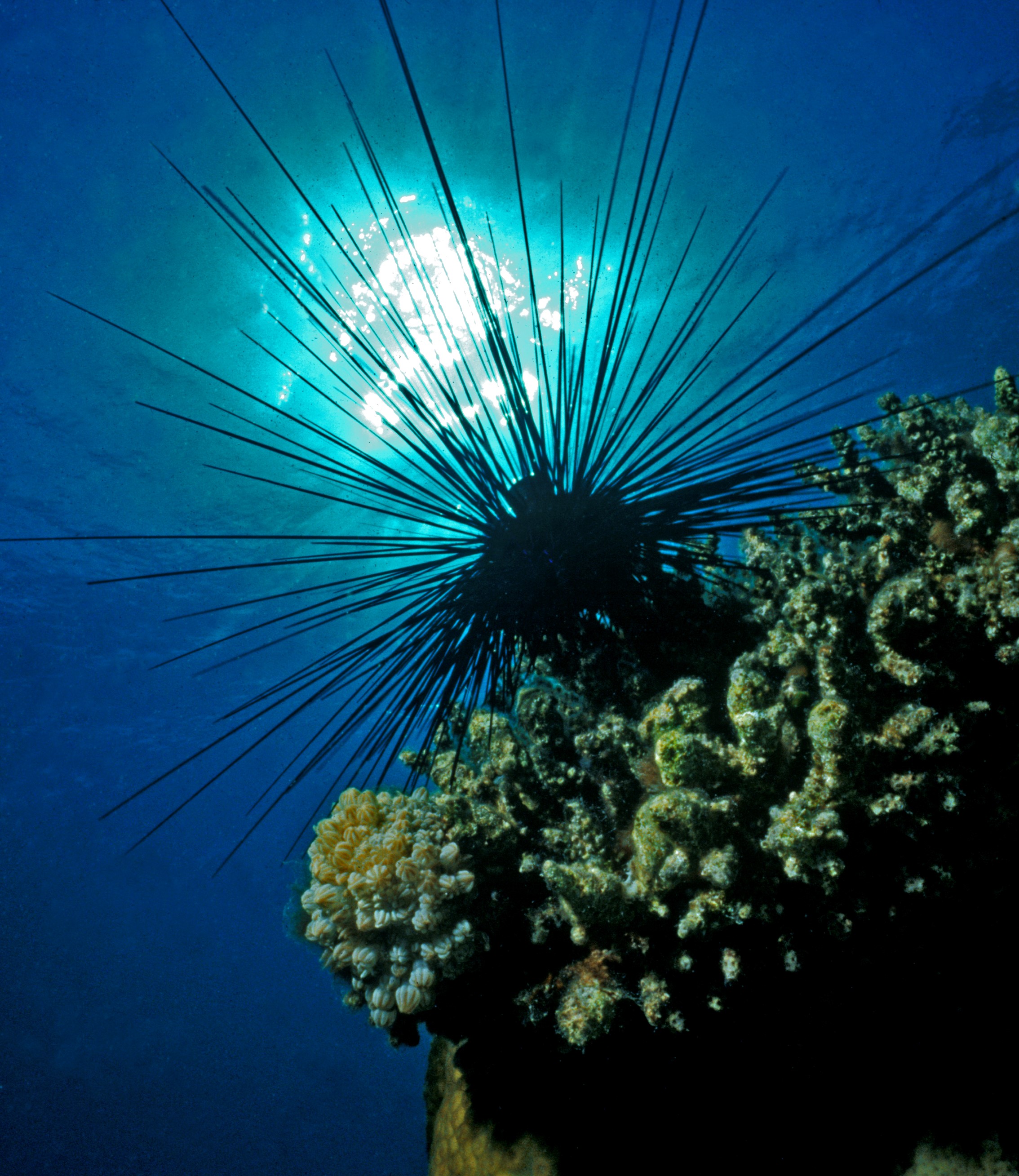 Repeated mass extinction events have also been experienced with the Caribbean species Diadema antillarum. In the early 1980s, 98 percent of all diadem sea urchins disappeared in the Caribbean. The few that survived have slowly recovered in recent years, but in 2022, a further mass extinction event killed approximately 95 percent of all sea urchins. The disappearance led to dramatic changes in coral reefs and overall underwater biodiversity in the respective regions. Over a short period of time, the colorful and species-rich coral reefs were transformed into a reef landscape overgrown with algae and home to much less varied species populations. This is because sea urchins fulfill an important function in the sea: They contain the spread of algae and thus create space for the settlement of larvae and slower-growing organisms, such as corals, mussels, and bryozoans. Grazing the algae also causes significant bioerosion of the subsoil.