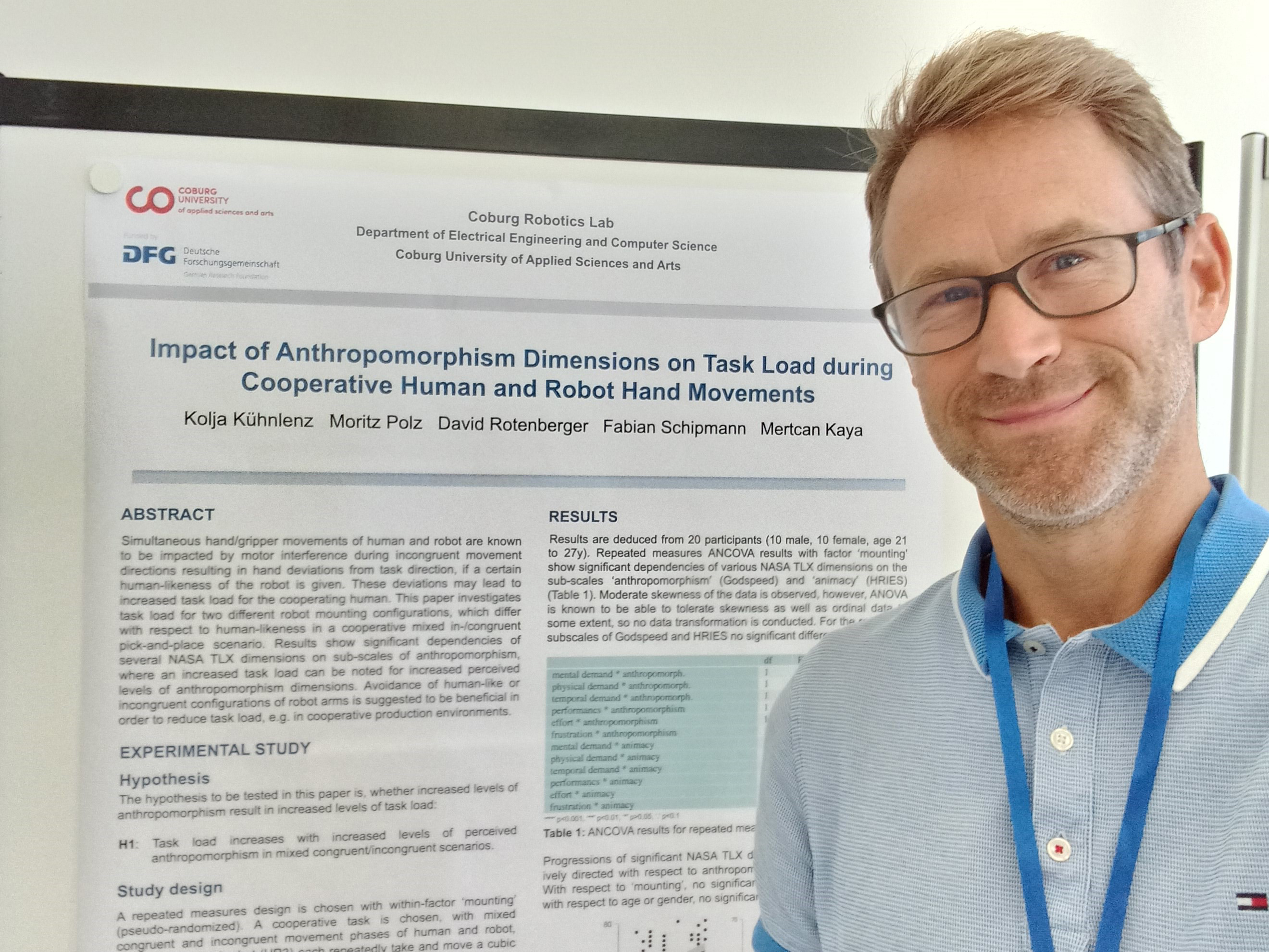 Wo Roboter Menschen ähneln, ist die Bedienung leicht, intuitiv. Normalerweise funktioniert die Zusammenarbeit zwischen Mensch und Maschine dann auch recht gut. „Menschenähnlichkeit in der Robotik hält immer mehr Einzug in eine Vielfalt von Bereichen: von kollaborativer Produktion bis hin zu Heimassistenz“, erklärt Prof. Dr. Kolja Kühnlenz. Er forscht und lehrt an der Fakultät Elektrotechnik und Informatik der Hochschule Coburg zu Themen wie Mensch-Roboter-Interaktion und „Soziale Robotik“, außerdem leitet er das Labor für Robotik und ist auch Studiengangsleiter für den Bachelor Automatisierungstechnik und Robotik. „Im Rahmen von Modulen und in verschiedenen Projektveranstaltungen arbeiten die Studierenden teils an vorderster Front der aktuellen Forschung mit – und das führt nicht selten sogar zu publizierbaren Ergebnissen, die auf dem internationalen Forschungsparkett gesehen werden.“ Diese Woche präsentierte der Coburger Professor auf dem 16th International Workshop on Human-Friendly Robotics (HFR 2023) das Ergebnis aus der Studie einer Studierendengruppe innerhalb des Moduls „Empirische Methoden in der Mensch-Maschine-Interaktion“. Organisiert wurde der HFR 2023 von der Technischen Universität München (TUM) und dem Deutschen Zentrum für Luft- und Raumfahrt (DLR). Der Coburger Posterbeitrag ist unter Kühnlenz‘ Leitung zusammen mit seinem Doktoranden Mertcan Kaya entstanden. Zu den Autoren gehören neben Kühnlenz und Kaya auch die Studierenden Moritz Polz, David Rotenberger und Fabian Schipmann.