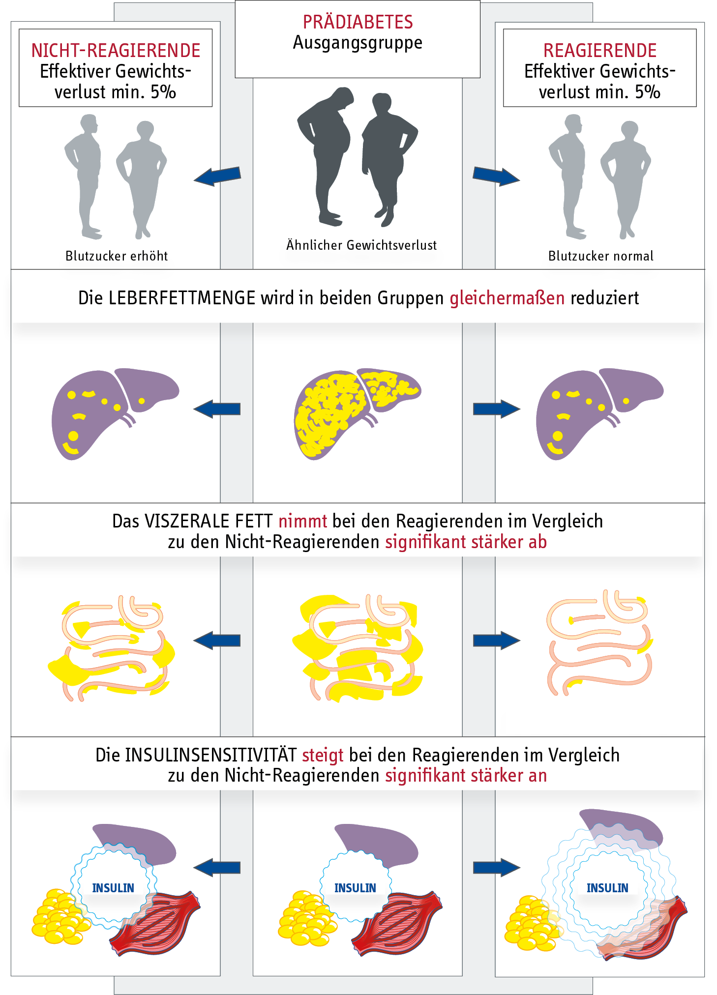 Entgegen ersten Vermutungen der Forschenden war es nicht der Gewichtsverlust, der die Menschen unterschied, die in Remission gingen und diejenigen, die nicht in Remission gingen, denn es gab zwischen den Respondern und Non-Respondern keinen Unterschied in der relativen Gewichtsabnahme. Jedoch zeichneten sich diejenigen, die eine Remission erreicht hatten, dadurch aus, dass sie stärker ihre Insulinsensitivität verbessern konnten als die Non-Responder. Anders ausgedrückt konnten sie ihre Empfindlichkeit gegenüber dem blutzuckersenkenden Hormon Insulin deutlich stärker steigern als die Non-Responder. Die Menge des ausgeschütteten Insulins blieb indes in beiden Gruppen unverändert. Dies stellt einen wichtigen Unterschied zur Remission von Typ-2-Diabetes dar, die insbesondere durch eine Verbesserung der Insulinausschüttung vermittelt wird.