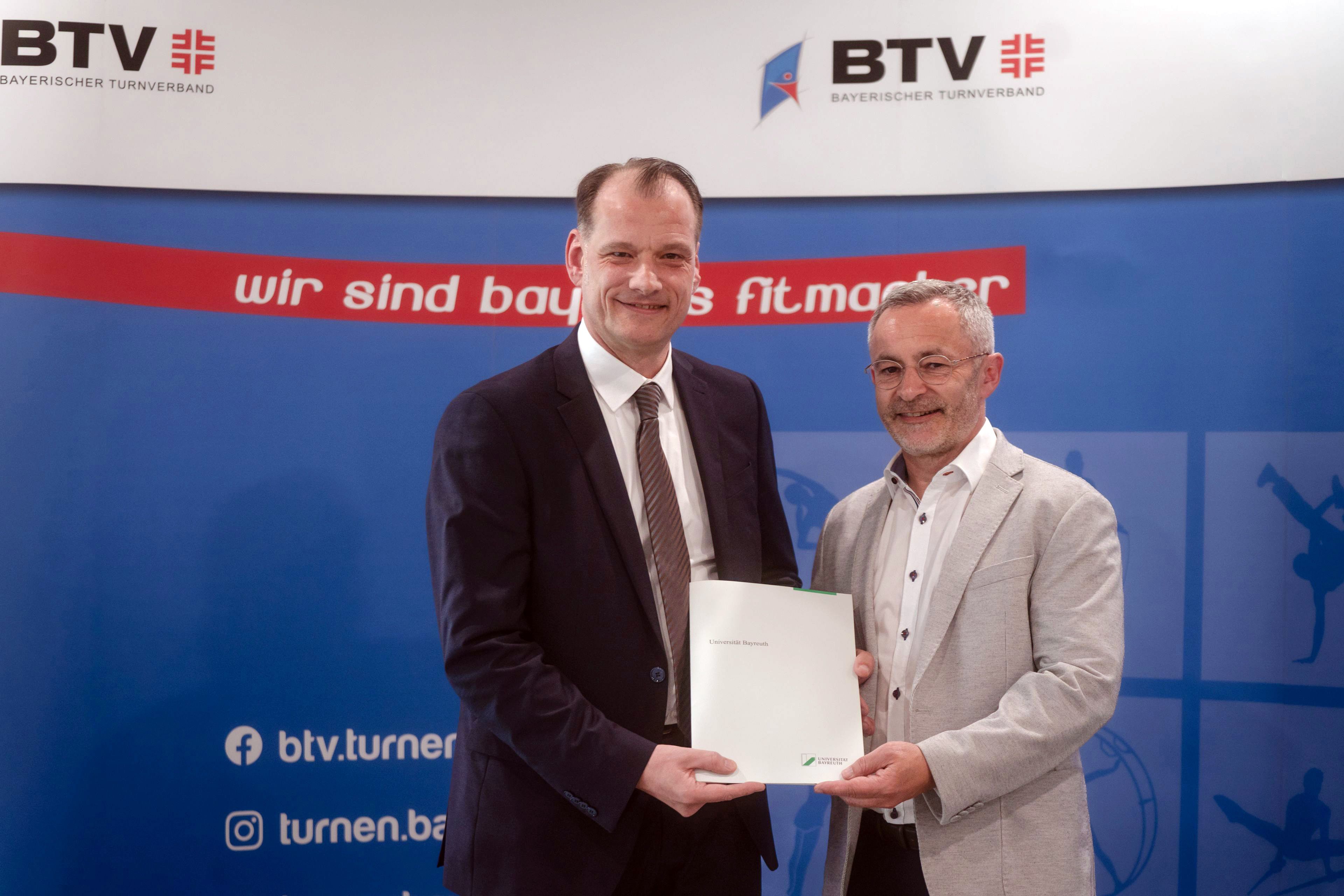 Der Bayerische Turnverband (BTV) und die Universität Bayreuth wollen ihre Zusammenarbeit ausweiten, um in gemeinsamen Studien neue Erkenntnisse zu gewinnen, Forschungsergebnisse in die Praxis umzusetzen und Studierenden Einblicke in die zunehmend wichtigen Bereiche Sport Governance und Eventmanagement zu geben. Eine entsprechende schriftliche Vereinbarung wurde kürzlich in Regensburg unterzeichnet. Die Zusammenarbeit zwischen dem BTV und dem Bayreuther Zentrum für Sportwissenschaft (BaySpo), einer zentralen wissenschaftlichen Einrichtung der Universität Bayreuth, wird beide Partnereinrichtungen stärken und innovative Lösungskonzepte für neue Herausforderungen im Sport fördern.