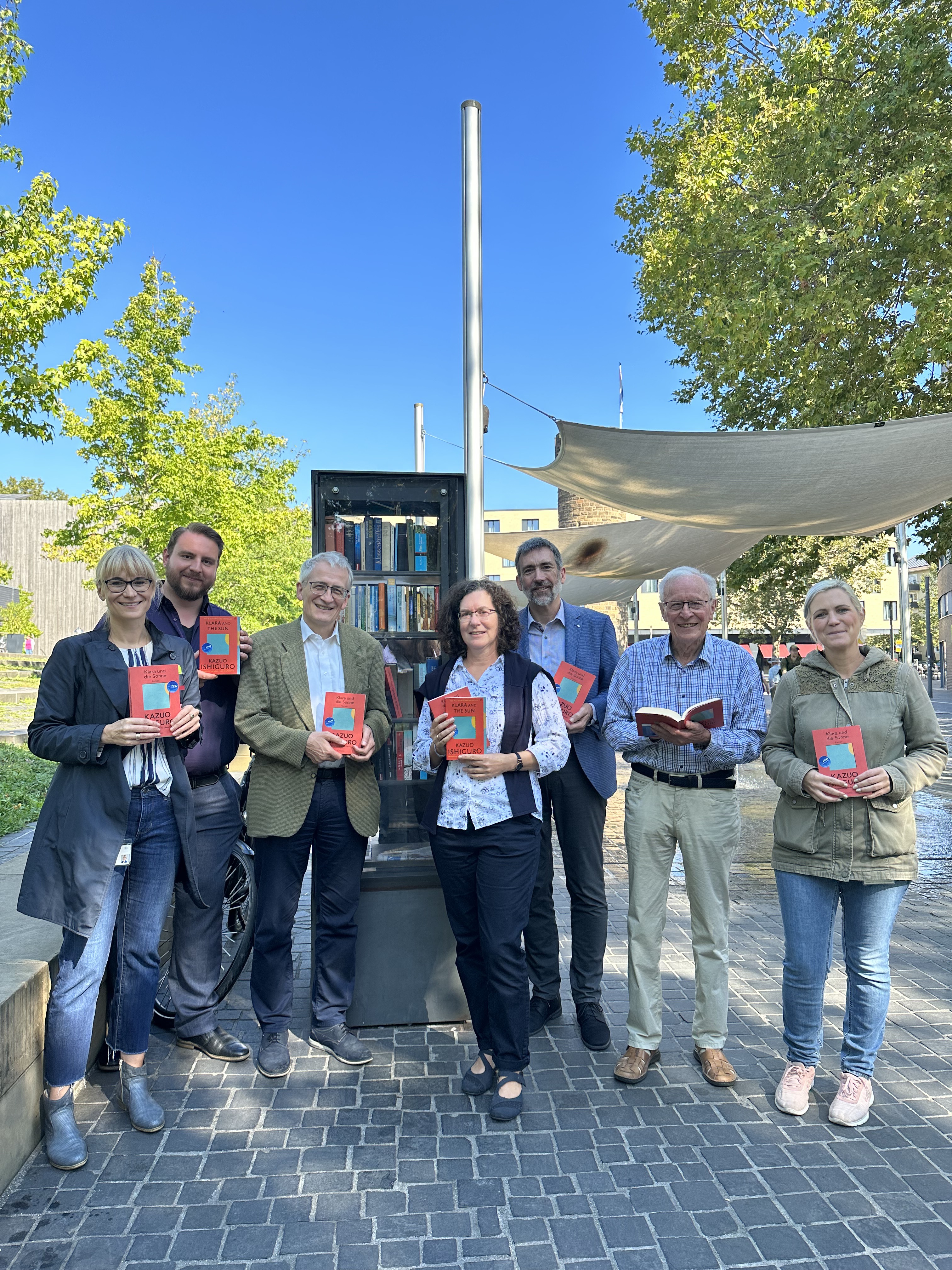 Um den Austausch über den Campus hinaus anzugehen, dürfen sich Bürger*innen der Region auf 40 freie Exemplare von „Klara und die Sonne“ freuen. Diese Bücher gehören niemandem und sollen über die Dauer des Projekts frei verfügbar und frei von Besitzansprüchen bleiben. Alle Leser*innen sind eingeladen, im Buch zu schmökern und bei Interesse an den diversen Austauschaktionen der HHN teilzunehmen. Bürger*innen finden auf allen Büchern blaue Sticker mit einem QR-Code. Dieser führt zur Projektwebsite, wo Interessierte mehr über die geplanten Veranstaltungen erfahren und Kommentare zum Roman hinterlassen können. Darüber hinaus kann der Roman auch in der Hochschulbibliothek LIV entliehen werden.