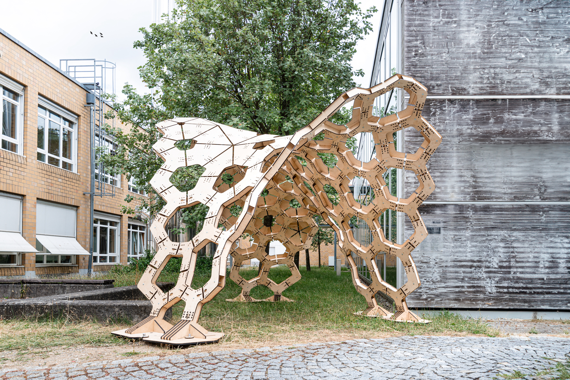 Sie sehen aus wie viele überdimensional große Bienenwaben, zusammengesteckt zu einem Wabengebilde, unter dem man hindurch laufen kann. „Carapacks“ ist das Ergebnis eines Design-Build-Projekts, das über mehrere Semester im Studiengang Architektur der Hochschule Biberach (HBC) stattfand. Das Team um die Vertretungsprofessoren Simon Vorhammer und Dr. Jonas Schikore, Prof. Dr. Christina Jeschke und Student David Ott ent-wickelte ein Konzept, um beliebig gekrümmte Freiformflächen als doppelschalige Stecksysteme umzusetzen. Entstanden ist ein Holzpavillon, der am Campus Stadt errichtet wurde.
