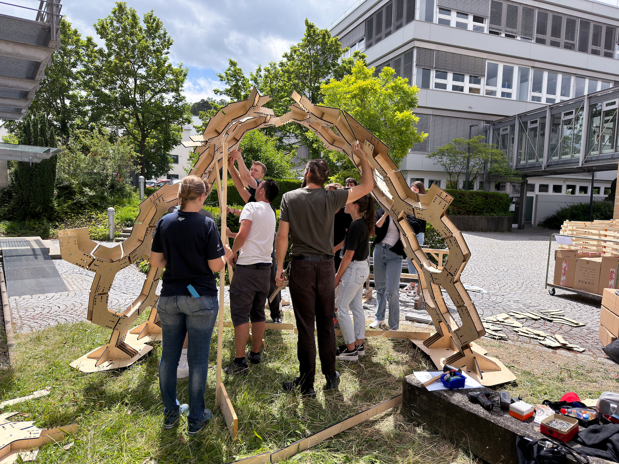 Das Besondere an diesem hexagonalen System ist, dass alle Bauteile torsionsfrei sind und lotrechte Schnittkanten aufweisen. Dies ermöglichte eine effiziente und kostengünstige Fertigung mittels Laser- oder Wasserstrahlschneidetechnik. Der Prototyp wurde aus Pappelholz gefräst. Dafür hat die Firma Georg Ackermann GmbH eine Woche lang ihre Lasermaschine zur Verfügung gestellt. Anschließend hat das Team jedes Teil geschliffen und in Lauge getunkt, damit bei Regen nichts abfärbt. „Uns war wichtig, dass sich die Montage der Teile unkompliziert gestaltet und von unseren Studierenden ohne den Einsatz schwerer Geräte durchgeführt werden konnte“, erklärt Simon Vorhammer. Gemeinsam mit seinen Studierenden hat er zwei Tage lang am Campus gewerkelt und den Pavillon errichtet. Auch Student Tobias Bischoff ist von der Einfachheit des Aufbaus begeistert: „Mich hat fasziniert, dass der Pavillon komplett vorgefertigt werden kann und auf dem Bauplatz ohne großartiges Wissen über das Projekt leicht und verständlich zusammensetzbar ist.“