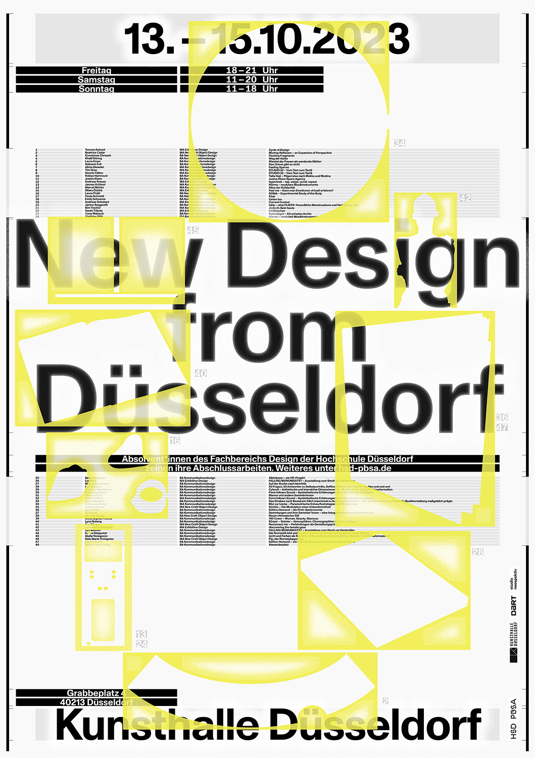 Erstmals stellen die für den HSD PBSA Design Award 2023 nominierten Absolvent*innen des Fachbereichs Design der Peter Behrens School of Arts der Hochschule Düsseldorf ihre Abschlussarbeiten in der Kunsthalle Düsseldorf aus. Die Ausstellung ‚New Design from Düsseldorf‘ zeigt über 40 Arbeiten aus den Studiengängen New Craft Object Design, Kommunikationsdesign, Retail Design und Exhibition Design.