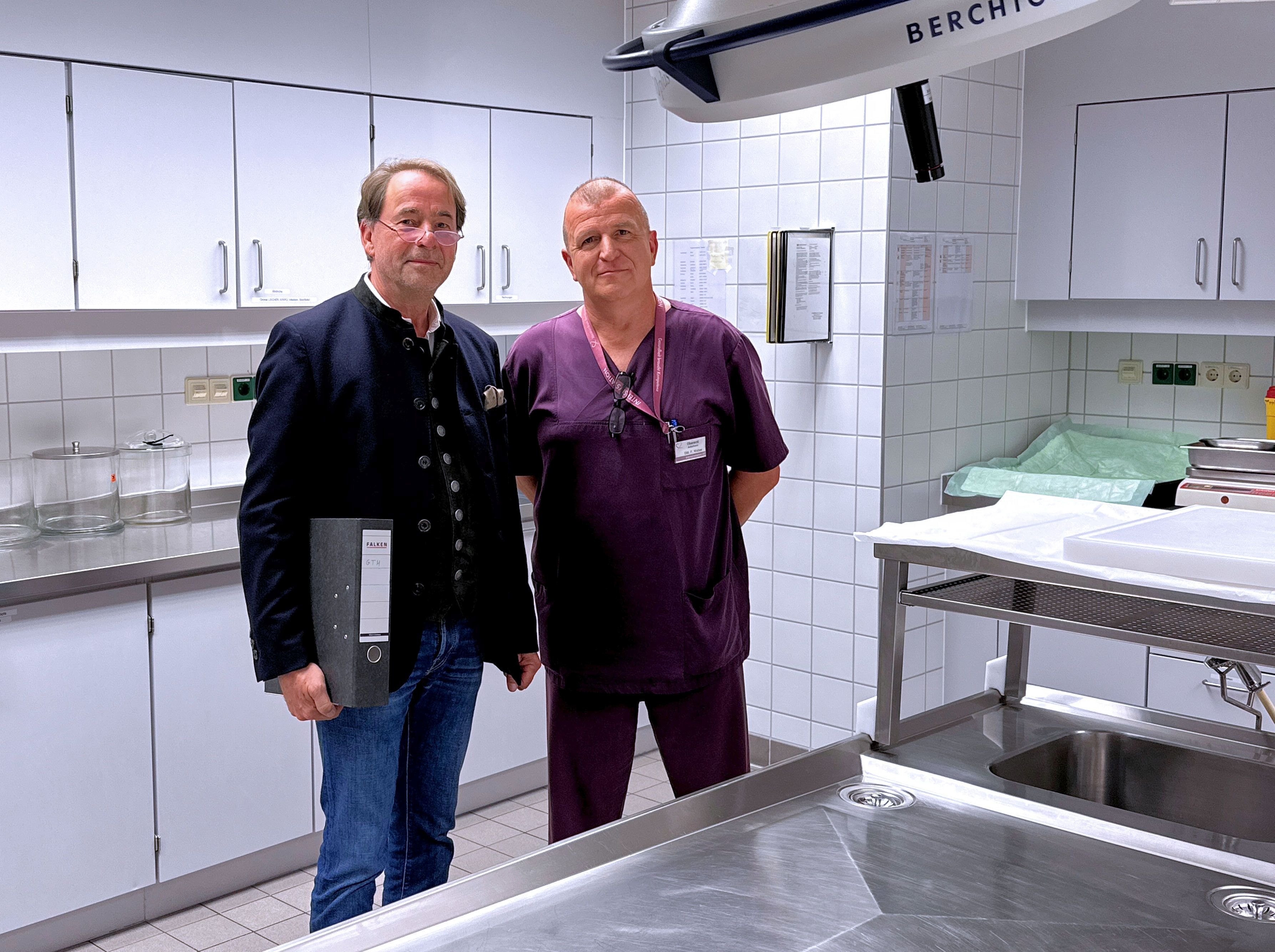 Kooperieren für eine bessere Versorgung mit Gewebespenden - Dr. Frank-Peter Nitschke, Geschäftsführender Arzt der Gesellschaft für Transplantationsmedizin MV aus Rostock (li.), mit dem Transplantationsbeauftragten des Harzklinikums Dorothea Christiane Erxleben, Frank Weber, Leitender Oberarzt der Quedlinburger Klinik für Anästhesiologie und Intensivmedizin, im Institut für Pathologie.