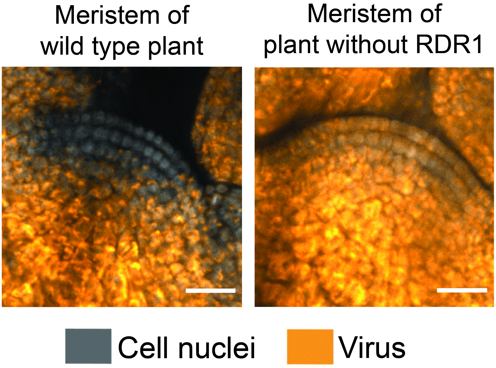 In the fight against Turnip mosaic virus, both salicylic acid and RDR1 are necessary to expel the virus from the stem cells – however, RDR1 is not produced within the stem cells themselves, but in the tissue below the stem cells and in the vasculature, Incarbone adds. “There it generates the RNA-based and most likely mobile information that immunizes the stem cells from the incoming virus. While we know infection triggers an overall increase in salicylic acid, we do not yet know where in the plant and at what time during infection this happens. We are currently trying to solve this puzzle.” But every virus is different. In the fight against other viruses, salicylic acid and RDR1 are activated but not necessarily required. “Based on our experiments with other viruses we can, however, conclude that RNA interference is always necessary to defend stem cells from infection.”