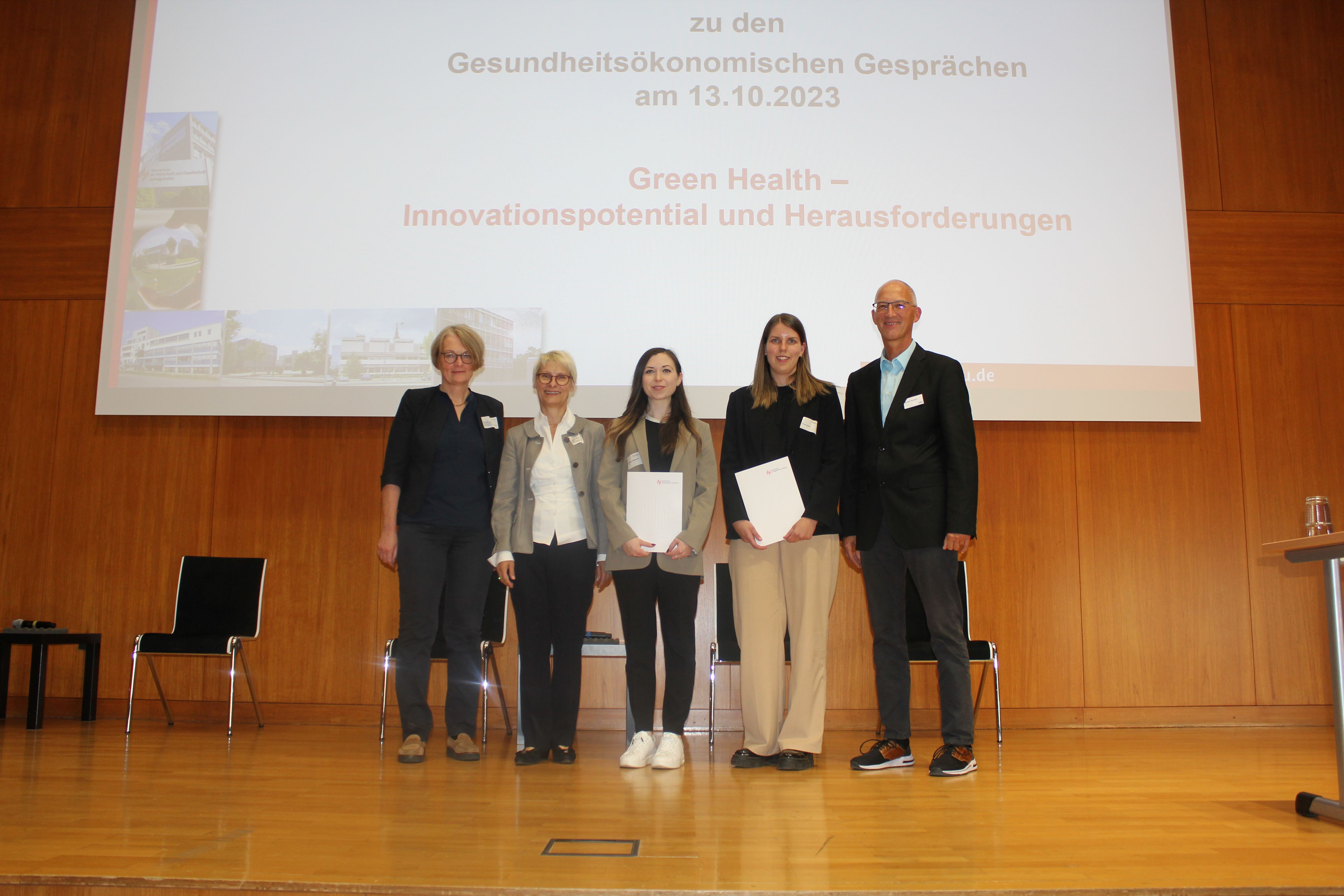Den Abschluss der Gesundheitsökonomischen Gespräche bildete auch in diesem Jahr die Verleihung der vom Förderverein Gesundheitsökonomie (GiP) gestifteten Preise für die beste Bachelor- und Masterarbeit. Vanessa Gergereder erhielt den mit 700 Euro dotierten Preis für ihre Bachelorarbeit „Führung im Rahmen von New Work am Beispiel der Führungsleitlinie der Siemens-Betriebskrankenkasse“; Saskia Staiger den mit 800 Euro dotieren Preis für ihre Masterarbeit „Health Literate Organizations – ein Konzept für Einrichtungen der Altenhilfe in Deutschland?“. Die Preise überreichte Rüdiger Burkhard, der 2. Vorsitzenden des Fördervereins Gesundheitsökonomie.