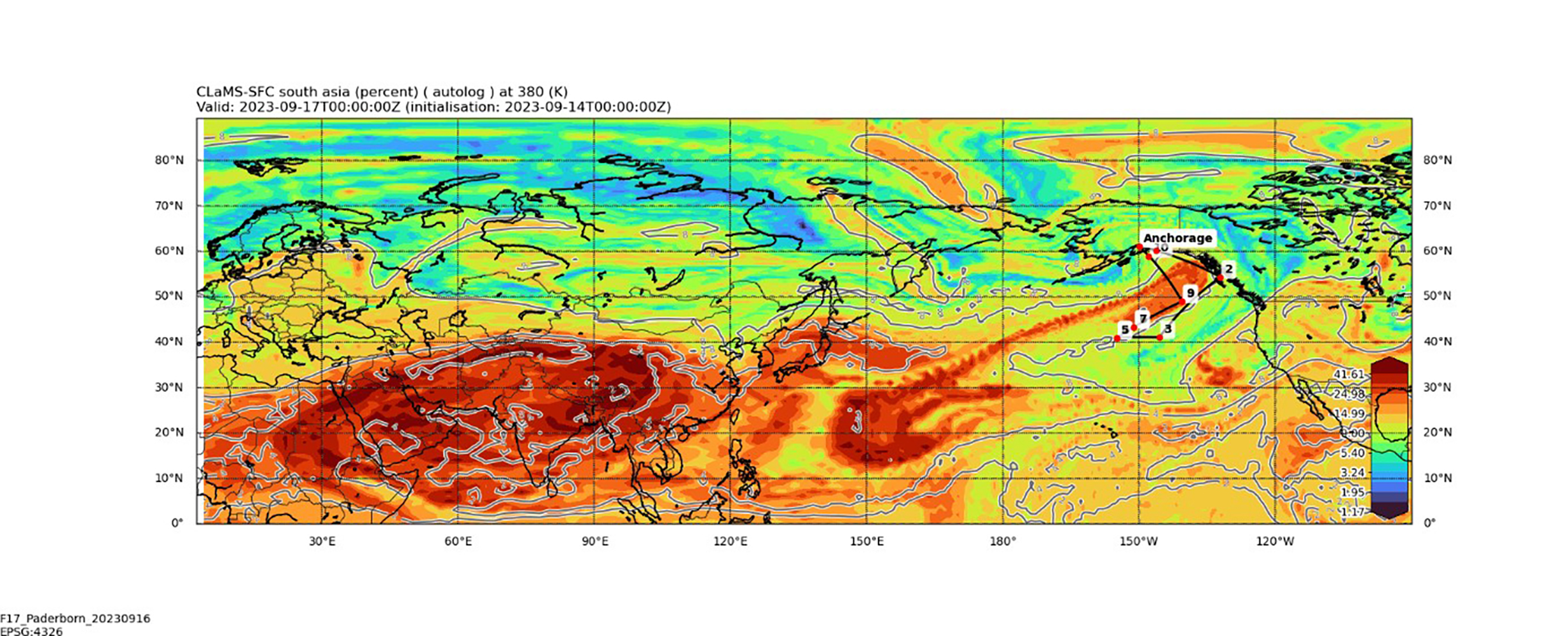 Transport of polluted air masses from the Asian monsoon region (red) over the Pacific on 17 September 2023. The black line near Alaska is the flight path of the HALO research aircraft during measurement flights. (ill./©: Martin Riese / Forschungszentrum Jülich)