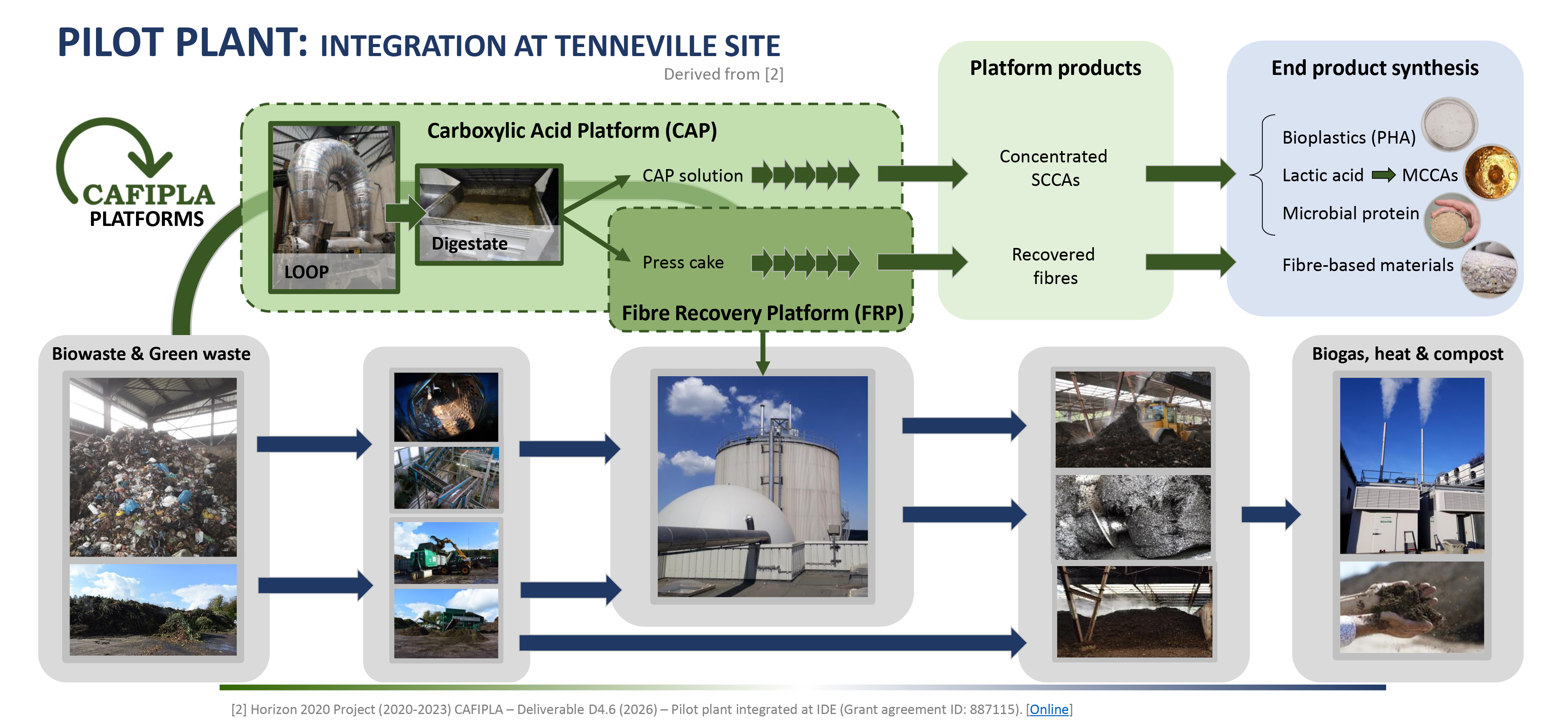 In the pilot plant built in Teneville (southern Belgium), two fractions of biomass (dry and wet) can be fermented or processed into fibre in parallel in the so-called "CAFIPLA LOOP". The "wet route" ferments the biomass, the digestate is then pressed and filtered. The resulting liquid is an SCCA concentrate, which serves as a feedstock for the production of bioplastics, medium-chain lactic acids and microbial protein. The short-chain carboxylic acids can also be processed into microbial protein powder for food and feed additives and fertilisers. The fibre residues of the fermentation residue as well as shredded green and paper waste serve as an additive for biogenic dressing materials, insulation and insulating materials, which are obtained from green waste via the "dry route".