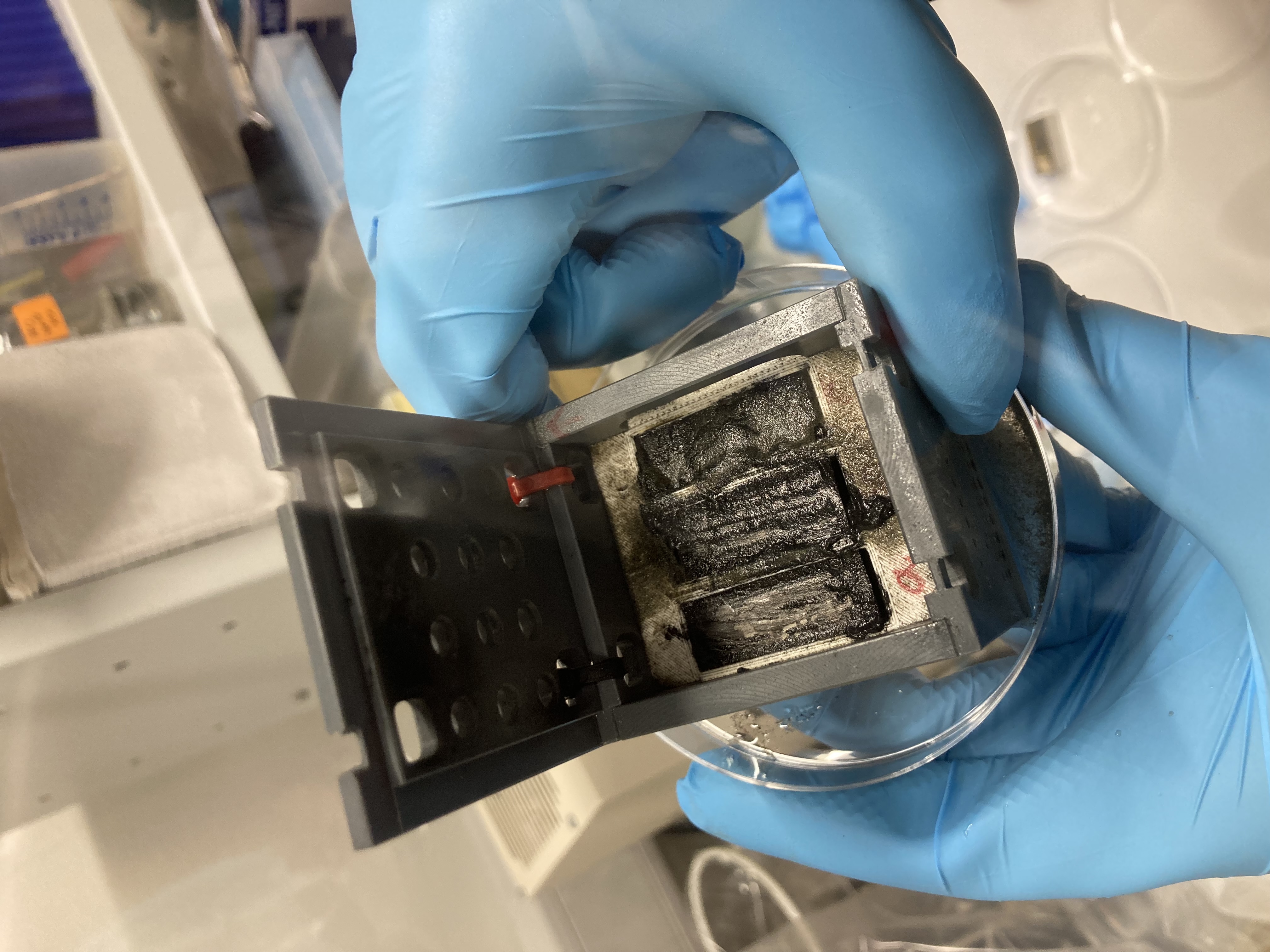 Bitte verwenden Sie folgende BU: "Drei Monate inkubierter Baustahl aus ca. 20 Metern Wassertiefe innerhalb des Monopiles. In dieser Wassertiefe besteht die Korrosionsschicht aus schwarzen Eisensulfiden, die unter anaeroben Bedingungen für mikrobiologische Untersuchungen beprobt werden."