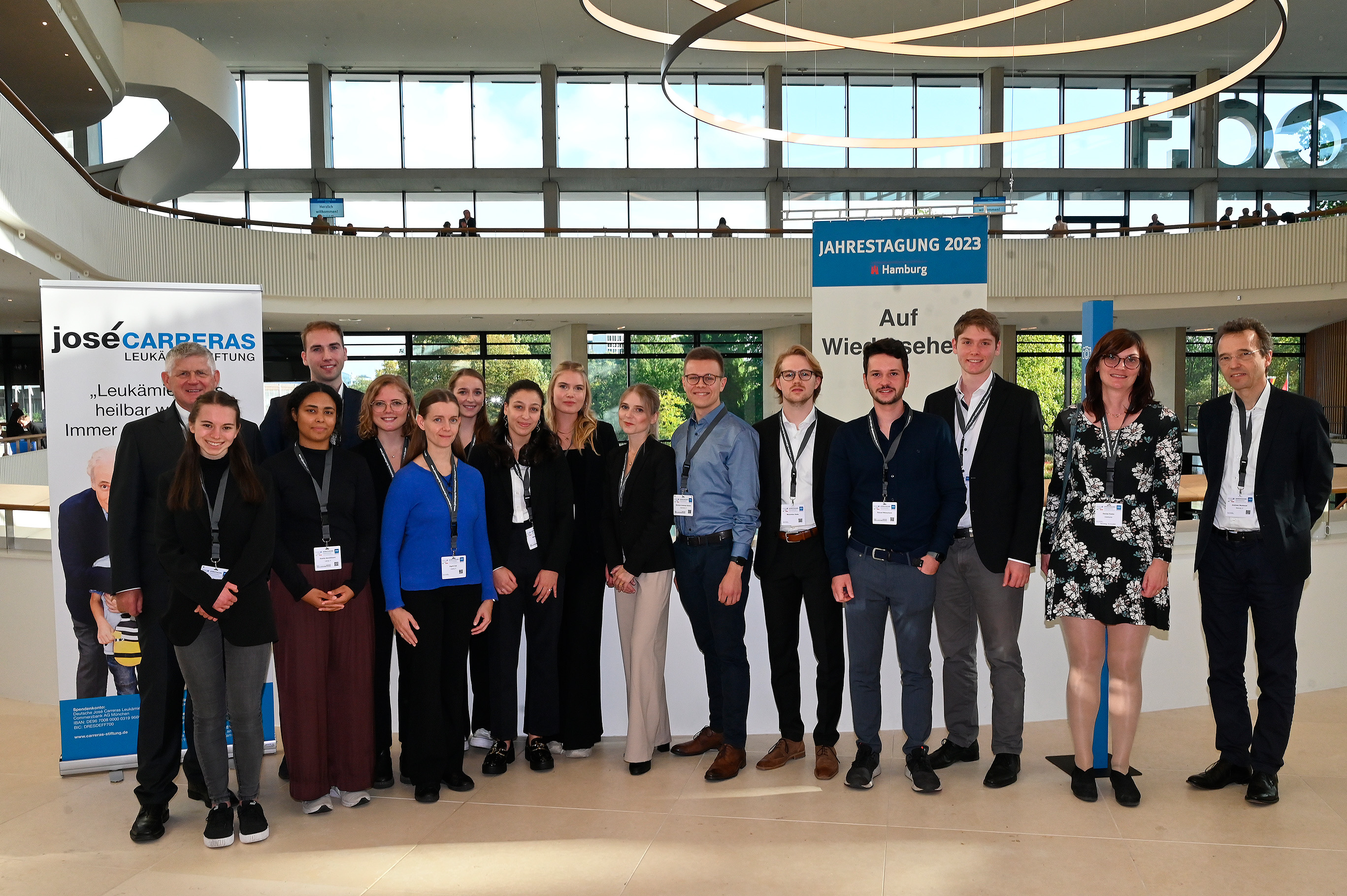 - Bildunterschrift: Auf dem DGHO-Kongress in Hamburg (von links): Prof. Dr. Andreas Hochhaus (Vorsitzender der DGHO), Lydia Karolius, Keshia Aerchlimann, Sven Liesenfelder, Laura Werner, Dr. Sigrid Uxa (aktuelle Forschungsstipendiatin), Anna-Sophia Hellmuth, Rihem Tadjine, Maria Wessels (ehem. Promotionsstipendiatin), Jana Nieruch, Giovanni Andreas Greiner, Dr. Maximilian Maurice Kiefer, Samuel Weinschenk, Julius Wolf Reckmann, Denise Kaske (DJCLS) und Prof. Dr. Andreas Neubauer (Mitglied des Stiftungsvorstands der José Carreras Leukämie-Stiftung)