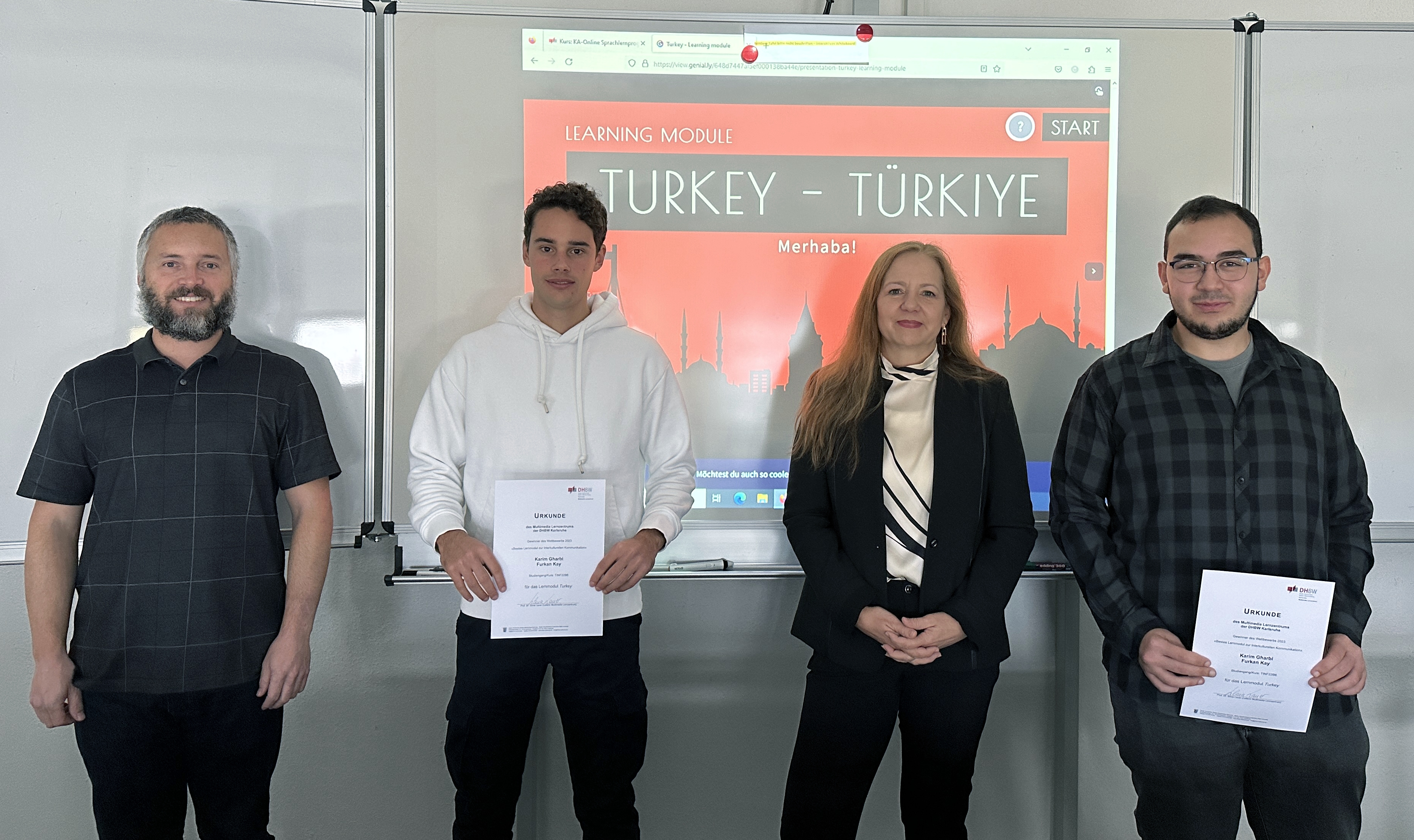 Ein visuell sehr ansprechendes, unterhaltsames und ausgesprochen informatives Lernprogramm entwickelten die beiden Studierenden Karim Gharbi und Furkan Kay des Kurses TINF22B6, die die Türkei in ihrem Lernmodul näher beleuchten. „Es hat großen Spaß gemacht, unser eigenes Lernmodul zu designen. Mit der Software war es erstaunlich leicht, Quizelemente in das Modul einzubauen. So kommt neben der Vermittlung der Theorie auch die Wissensabfrage nicht zu kurz.“, konstatiert Furkan Kay. Karim Gharbi ergänzt: „Dass die Unterschiede in der Geschäfts- und Alltagskultur so groß sind, hat mich überrascht. Ich habe sehr viel über die Türkei gelernt.“ Das Lernmodul der beiden Gewinner kann unter https://view.genial.ly/648d7447af5ef000138ba44e/presentation-turkey-learning-module aufgerufen werden und ist für Studierende auch auf der Lernplattform der DHBW Karlsruhe zugänglich.